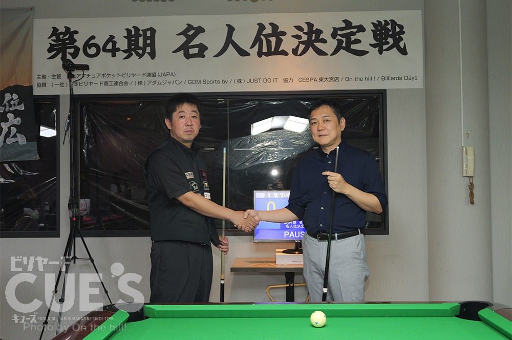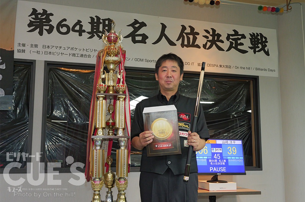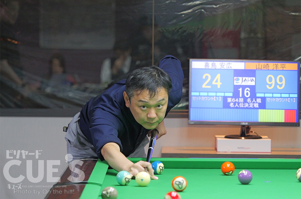 戦前の正直な下馬評では、アマローテA級優勝経験者でもある島田が勝ち上がった方が名人位奪取のチャンスは高かったのではないか、という声が多かった。しかし、ローテーション300点の5セット先取という、よほどのワンサイドになっても5時間は越えるという長丁場の戦いで、山﨑はその豊富な試合経験を遺憾なく発揮して普段通りの球撞きを披露してみせた。