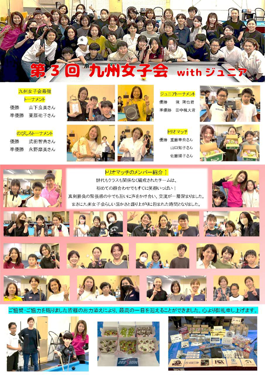 山内プロのコメントにある通り、イベントに参加した全ての女子 & ジュニアがビリヤードを楽しむことをメインに、継続性を持って意欲的に取り組まれている九州女子会。定番イベントの1つとして、これからもさらに成長していくことに期待したい。
