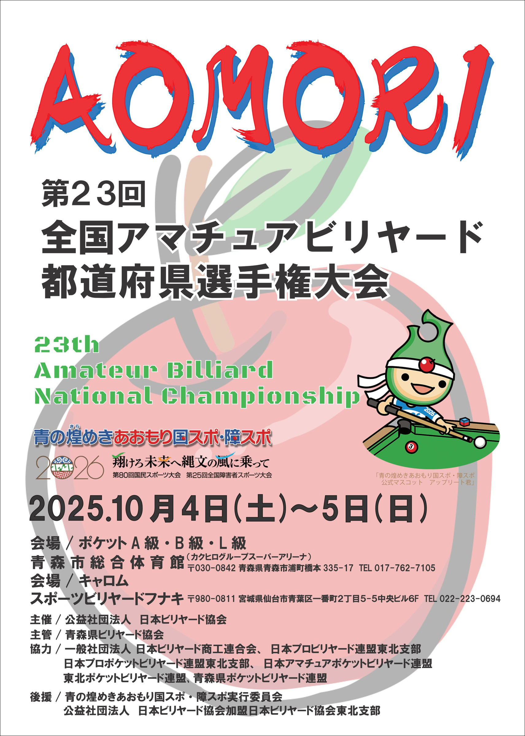 10月4日~5日(土・日)の日程で、青森県と宮城県を舞台に『公益社団法人 日本ビリヤード協会』(NBA)主催、『青森県ビリヤード協会』主管による、『第23回アマチュアビリヤード都道府県選手権大会』が開催される。