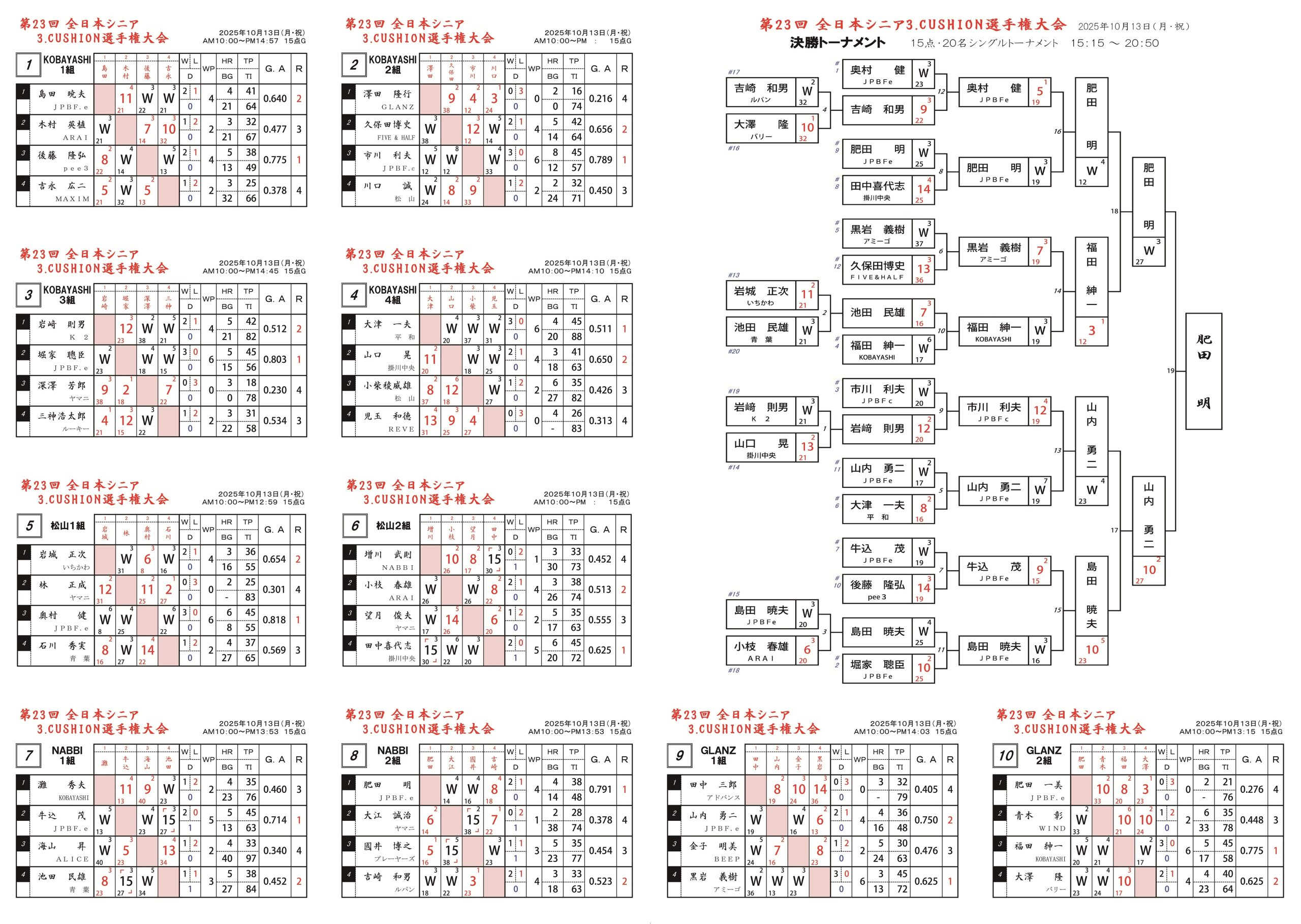 10月13日(月・祝)、東京・新大久保の『KOBAYASHI -BRIGHT-』を会場(予選は『松山』、『NABBI』、『GLANZ』を併用)に『日本プロビリヤード連盟』(JPBF)主催による『第23回全日本シニア3C選手権大会』が開催された。