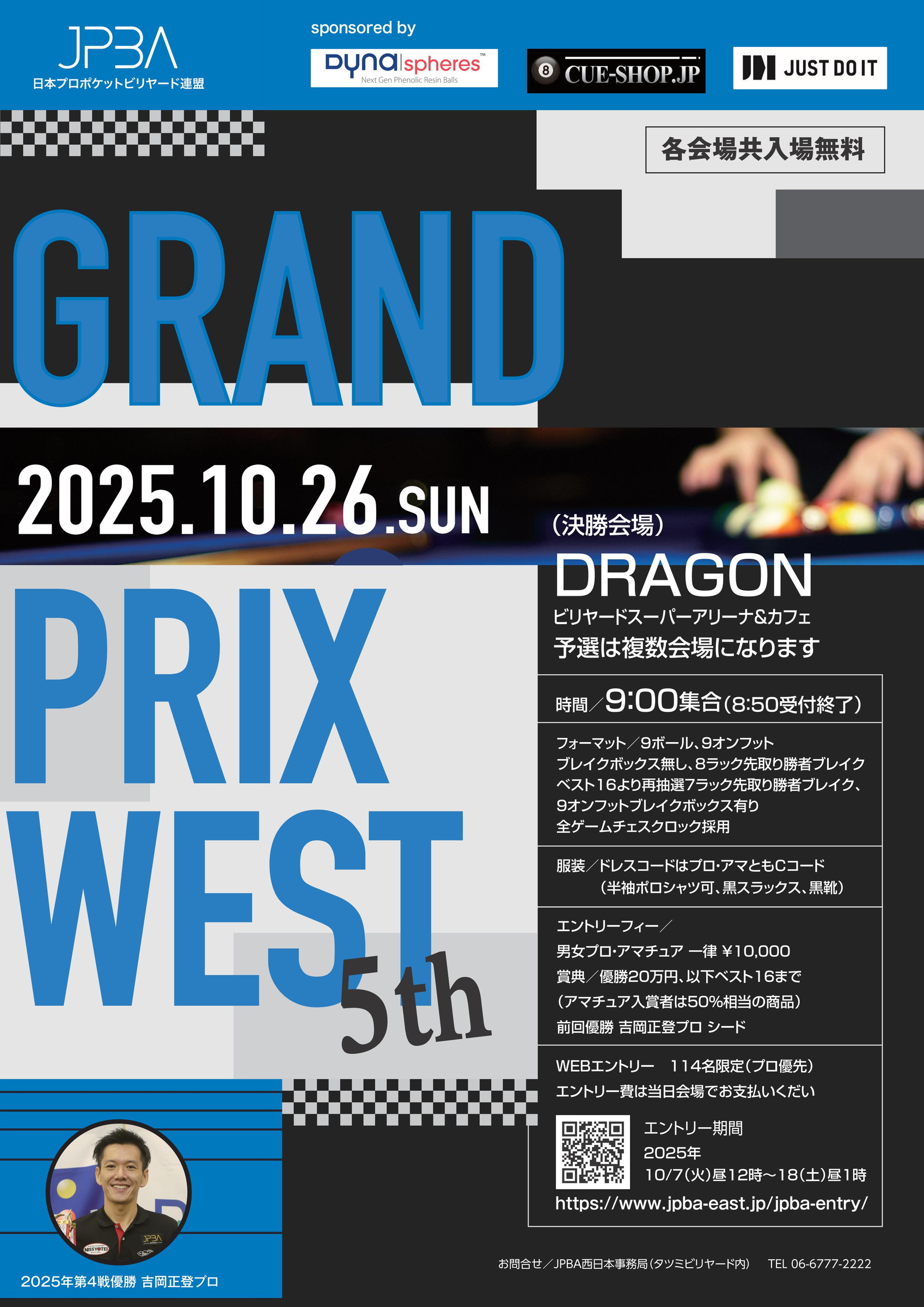 10月26日(日)、『日本プロポケットビリヤード連盟』(JPBA)西日本主催のランキング対象公式戦『グランプリウェスト第5戦』が開催される。決勝会場となるのは、大阪市東成区の『BILLIARDS SUPER ARENA & CAFE DRAGON』で、予選はこの他、大阪市内の『Billiard & Darts SUN』、『ビリヤードジムAMII 大阪市立大学前店』、『アイオイステージ』、『タツミ』、『マグスミノエ』の5会場となっている(組み合わせはこちら)。