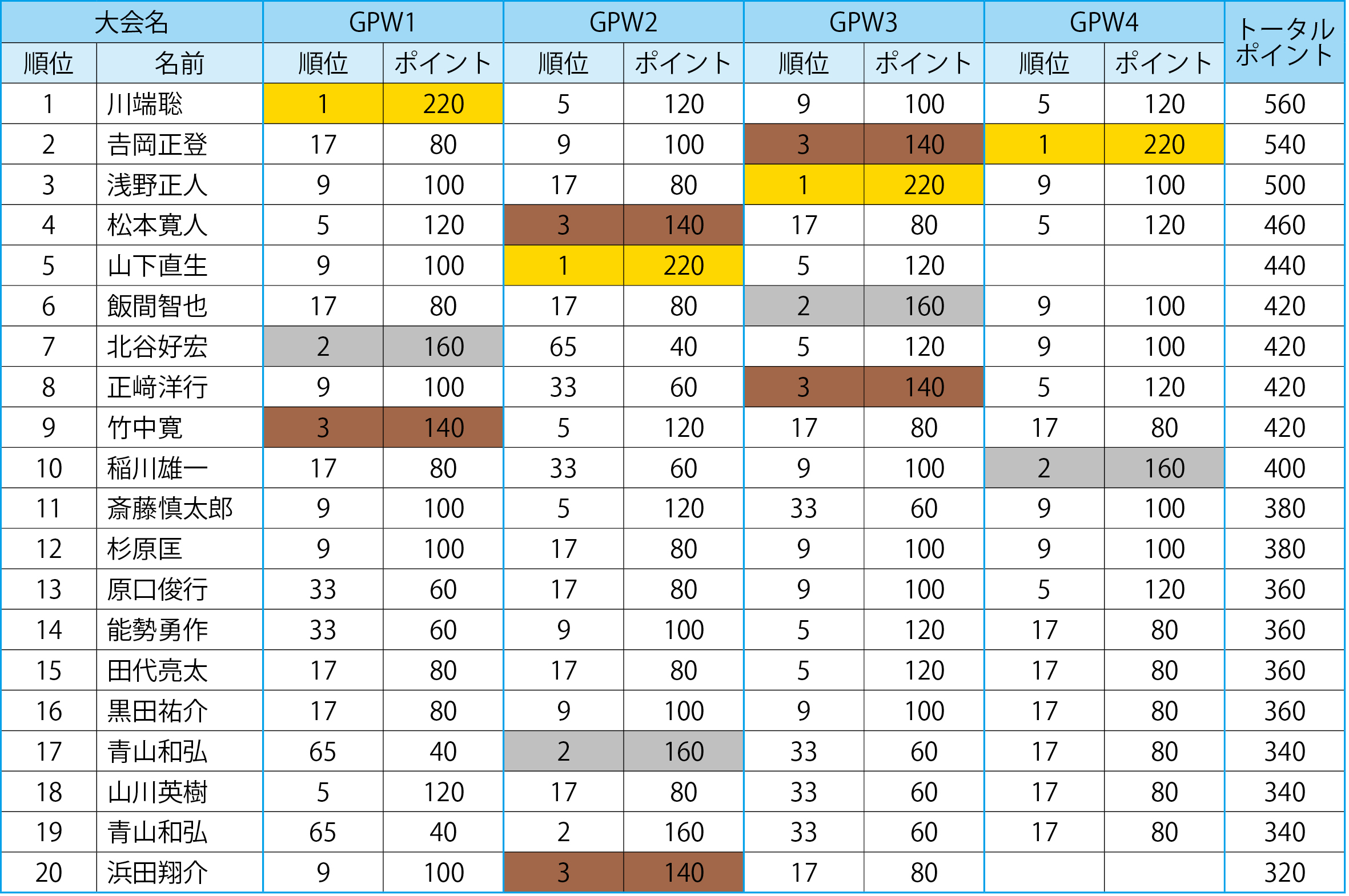今年全6戦が予定されているグランプリウエストは、ここまでの4戦で川端聡、山下直生、浅野正人、吉岡正登と、優勝者が全て変わる大混戦となっている。グランプリウェストのみのポイントを集計したランキングは以下の通りとなっており、全戦でベスト16入りを果たしているトップの川端を尻上がりに調子を上げてきた吉岡が追い上げている状況で、その吉岡は今回は前戦優勝シードとして決勝トーナメントからのスタートとなる。
