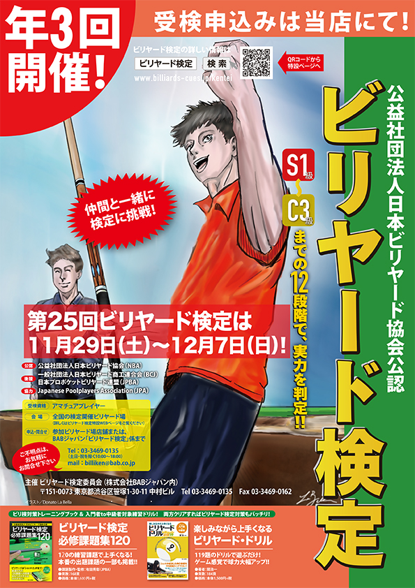 『公益社団法人日本ビリヤード協会』(NBA)公認のビリヤード唯一の技術検定である『第25回ビリヤード検定』が、11月29日(土)〜12月9日(日)の日程で、全国各地の開催登録ビリヤード場を会場に開催されます。