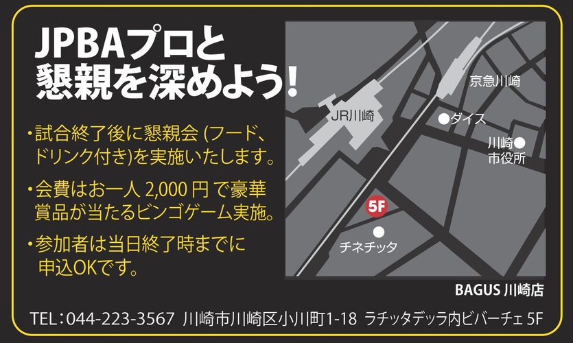 11月9日(日)、神奈川県川崎市の『バグース川崎店』を会場に『日本プロポケットビリヤード連盟』(JPBA)東日本ブロック主催の『グランプリイースト第6戦』決勝トーナメントが開催される。前日の8日(土)には、『NIKKA5』、ビリヤード・ロサ(以上東京)、『バグース川崎店』、『POOL LABO』(以上神奈川)、『Link西川口店』、『Link和光市店』(以上埼玉)の6会場で関東予選が開催される(関東予選の組み合わせはこちら)。