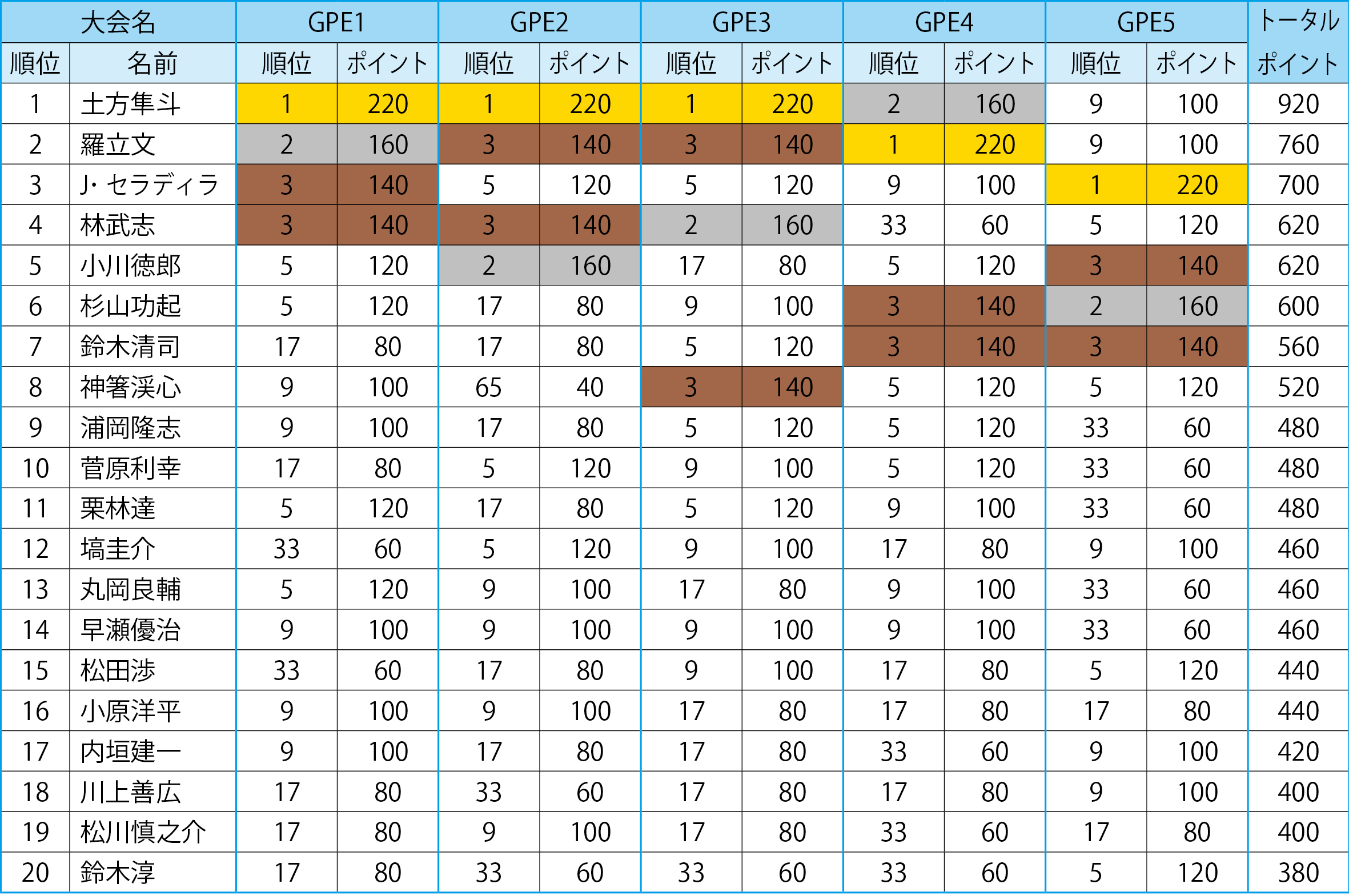 第5戦を終わってのグランプリイーストランキングは、第1戦から3連勝を果たし、その後も準優勝、9位タイとポイントを積み重ねている土方隼斗で、それを追う2位が羅立文。2人のポイント差は260ポイントとなっており、羅が最終戦に勝って220ポイントを積み上げたとしても、土方が33位タイ(60ポイント)以上の成績を挙げればMVPが決定する極めて有利な状況。また、今回決勝トーナメントからスタートするセラディラはすでに100ポイント以上を確定させているため、初のトップ3に食い込む可能性が高い。