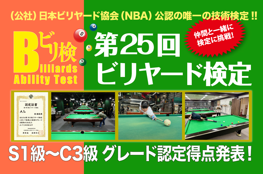 現在ビリヤード検定オフィシャルページにて第25回ビリヤード検定のグレード認定得点を発表しております。認定得点とはC3級〜S1級まで12のグレードそれぞれの合格となるボーダーラインの点数です。C級を受けた方はC3〜C1級、B級の方はB3〜B1級内の認定となっております。正式な合格発表は、本ページにて12月下旬を目処に発表いたしますのでご確認をよろしくお願いします。