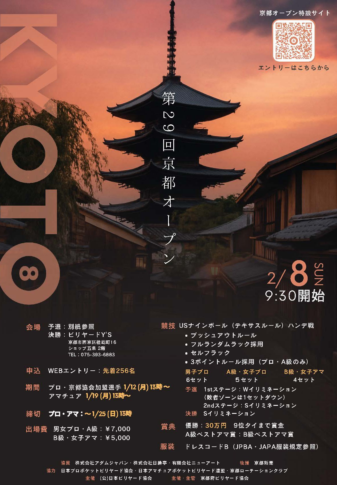 さらにNBAは、加盟競技団体主催・主管のものとは別に、様々なカテゴリーの全日本選手権を含む大会を主催することも多く、今シーズンも例年同様に数多くのトーナメント開催を予定している。その中で2026年の開幕を飾るのが、ジャパンプール興隆の地でもある「玉のみやこ」京都を舞台に2月8日(日)に開催される『第29回京都オープン』で、この大会は毎年関西圏を中心に数多くのプロ・アマが参戦する人気のトーナメントとして定着している。