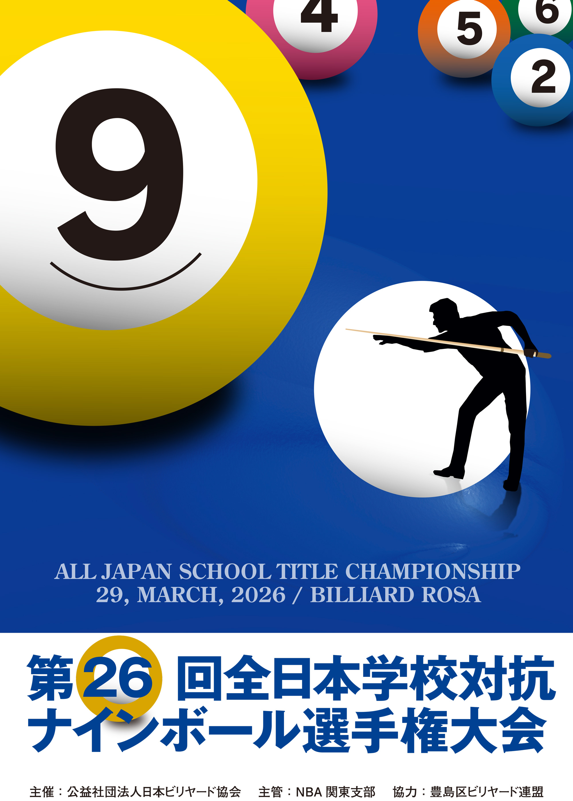 NBA主催大会として3月29日(日)に開催されるのが、東京・池袋の『ビリヤード・ロサ』が会場となった『第26回全日本学校対抗ナインボール選手権大会』。この大会は同一校在学中の2人1組による対抗戦で、シード校を含む全国各地から20チームが集って日本一を争うトーナメントで、出場資格は「国・公立学校及び学校法人取得の学校在学者(新卒予定者を含む)」となっており、毎年紫紺の優勝旗をかけた熱い戦いが繰り広げられている。