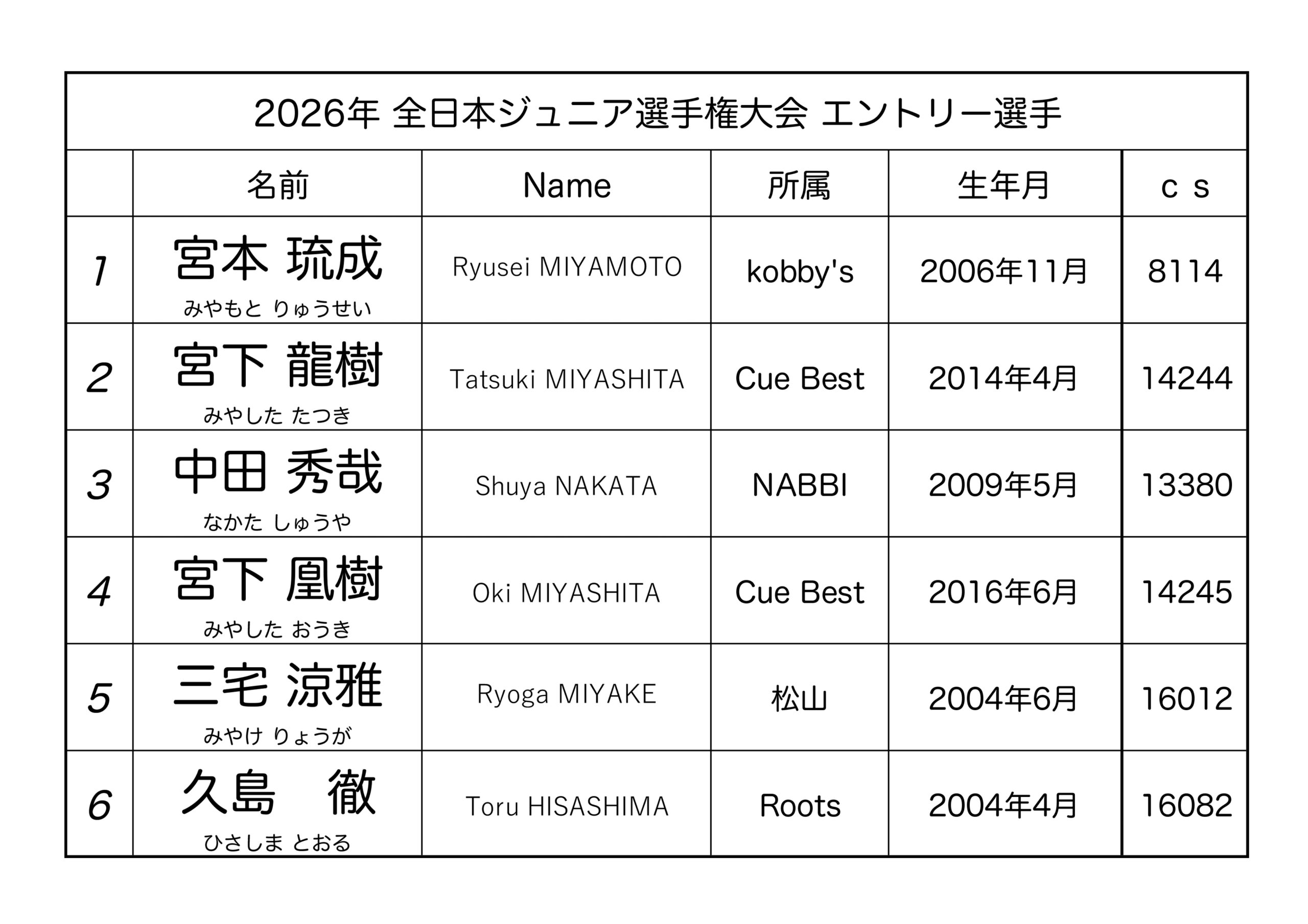 ・第2回全日本ジュニア選手権大会出場者