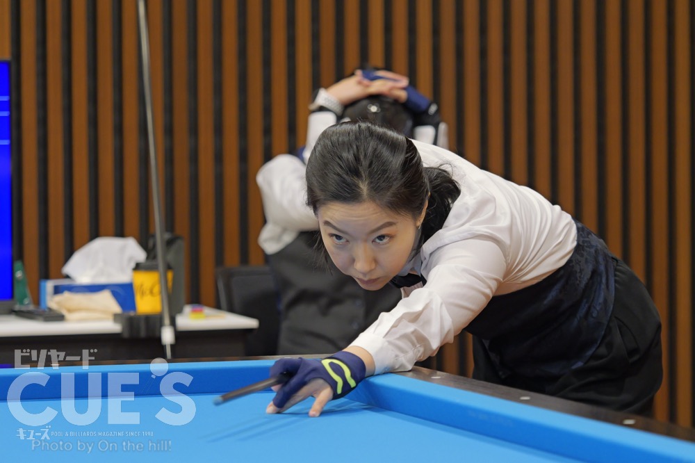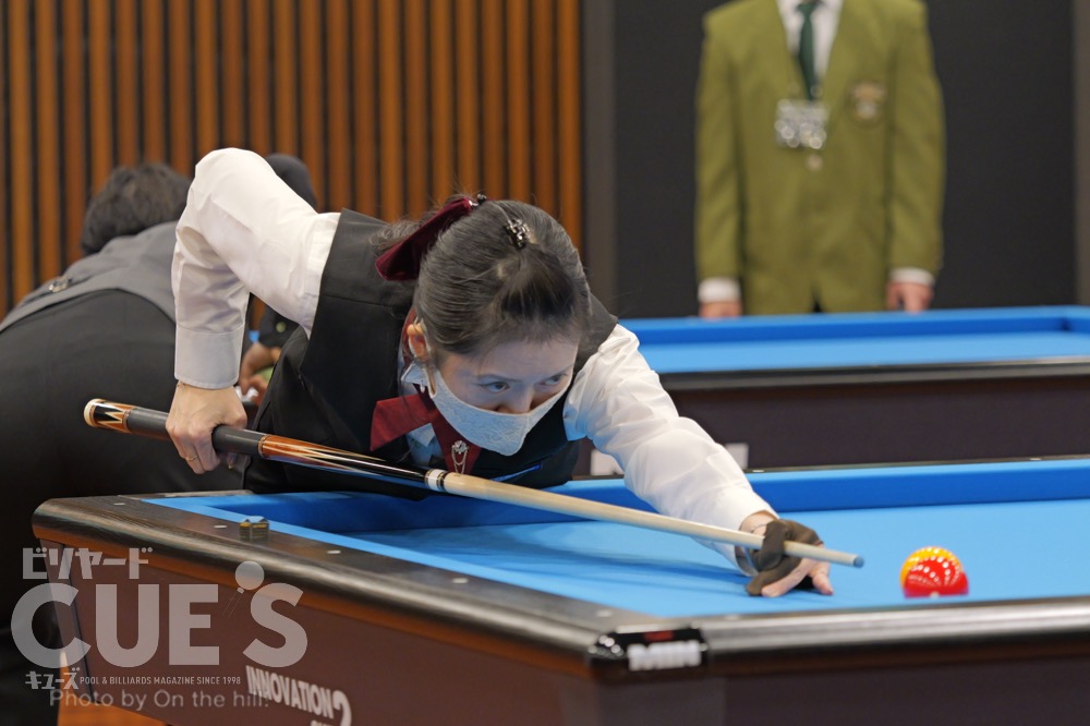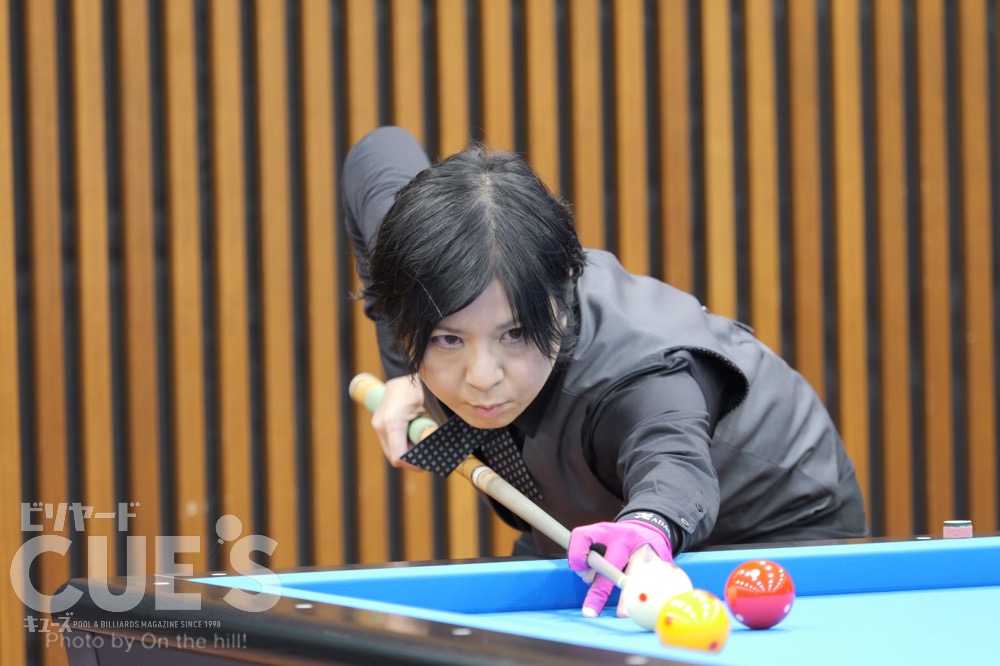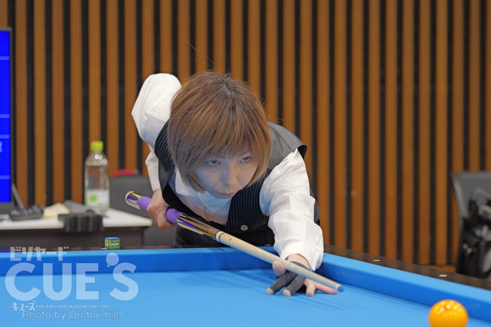 宮下と、昨年大会準優勝で女子スリークッション世界選手権日本代表の経験も持つ深尾典子アマ(関東代表)が同居するグループBは、第1回転で宮下が林田薫アマ(北陸代表)とドロー、深尾アマが福田麻理子アマ(関東代表)に勝利した後の第2回転で2人が対決。この試合に14イニング、アベレージ1.143、ハイラン6点で勝利した宮下が1勝1分けで暫定トップに立ちリーグ戦を優位に進めている。