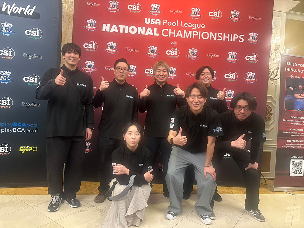 ナショナルチャンピオンシップでは、プロイベントと並行して11日間でナインボール、エイトボール、テンボールのチーム戦と個人戦が行われ、毎日約12,000人ほどのプレイヤーが壮大なスケールのアマチュアイベントエリアでプレーし全米ナンバーワンを競ったのだが、ここにUSAPLの日本ディヴィジョンである『JAPAN CSI POOL LEAGUE』(JCL)の代表チームが3年連続で参戦した。