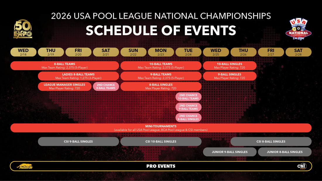 世界中からワールドトップスター集結し、11日間の日程でWPA公認の世界チーム選手権を含む男女、ジュニア合わせて6つのイベントが開催されたPBSによる『LAS VEGAS 2026』。この期間中には、アメリカを中心に、FargoRateを使用した特徴あるハンデ制のアマチュアリーグを展開している『USA Pool League』(USAPL)が年に一度開催しているビッグイベント『2026 USA POOL LEAGUE NATIONAL CHAMPIONSHIPS』(ナショナルチャンピオンシップ)が同時に開催された。