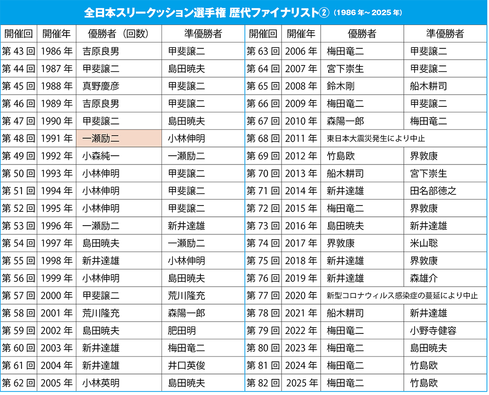 今年の注目は何と言っても梅田竜二が前人未踏の大会5連覇&8勝を達成するかどうかだ。昨年後半にはジャパンカップとADAM杯を制して年度MVPを獲得しているだけに、優勝候補の筆頭であることは間違いない。対抗の一番手は2年連続準優勝の竹島欧だろう。竹島が勝てば14年ぶり2勝目だ。