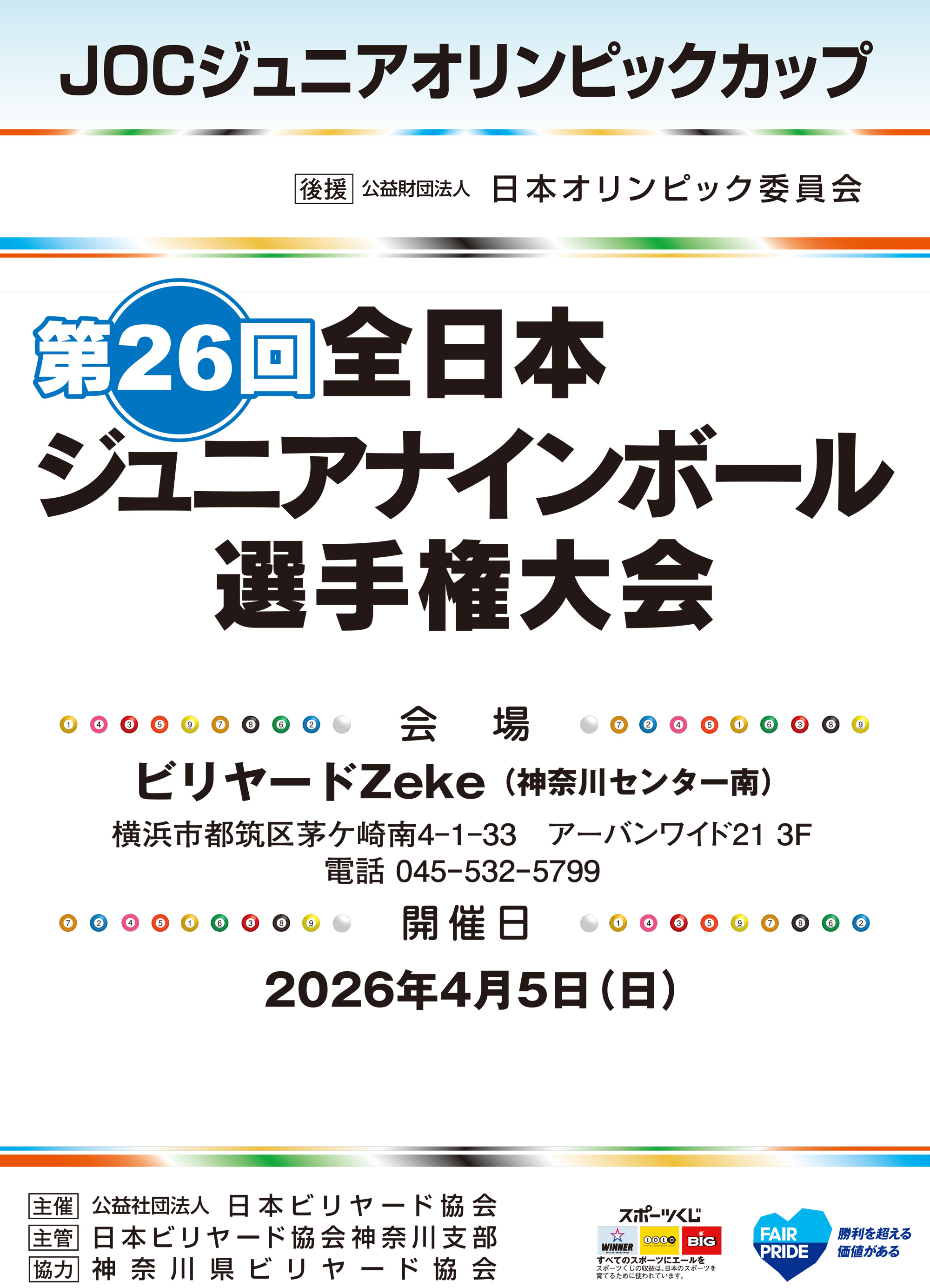 4月5日(日)、『公益社団法人日本ビリヤード協会』(NBA)主催による『JOCジュニアオリンピックカップ 第26回全日本ジュニアナインボール選手権大会』が、神奈川県横浜市の『Zeke』を会場に開催される。