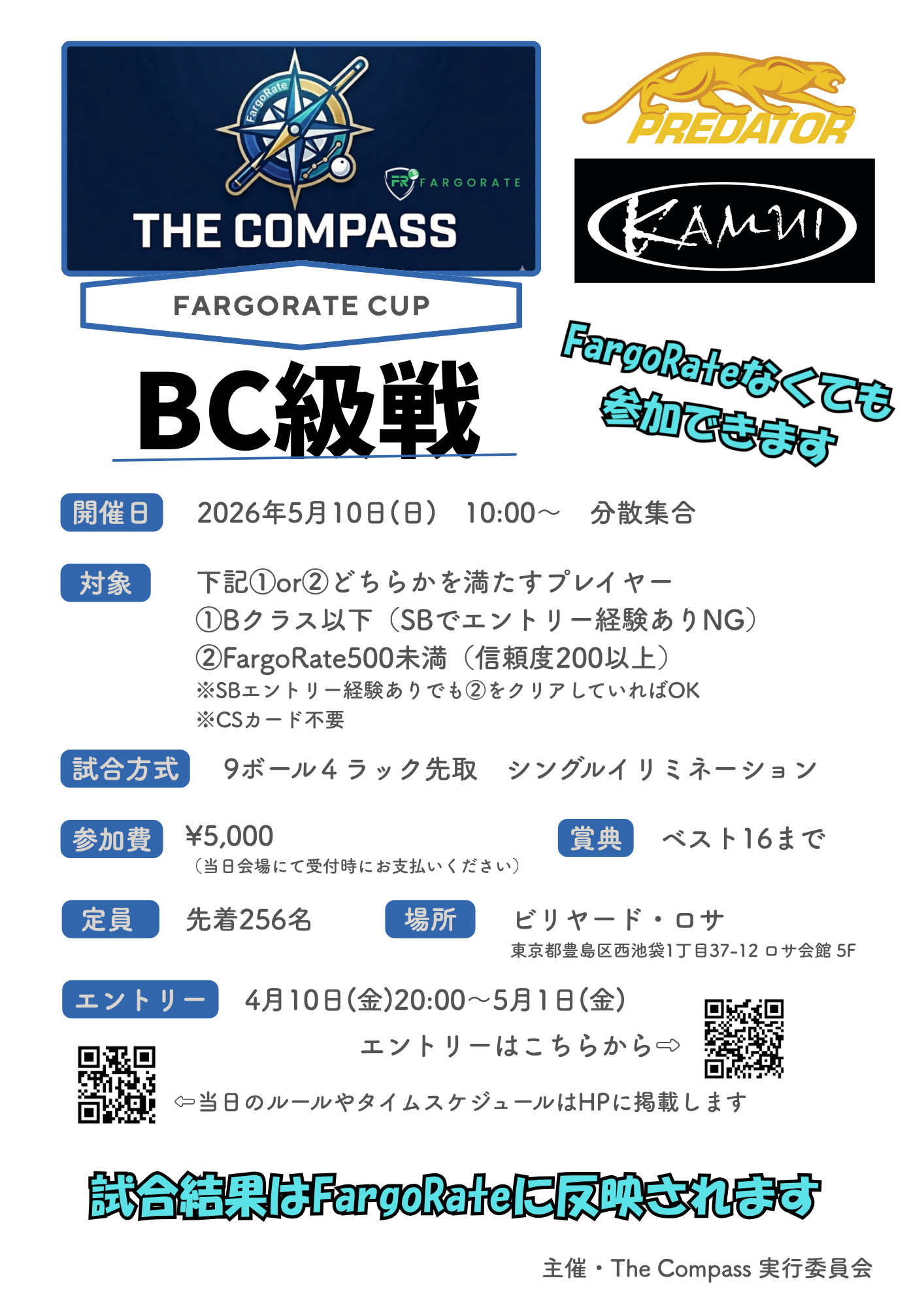 JCLでは来月、リーグ未加入の一般プレイヤーもFargoRateを体験できる新イベント「The Compass(コンパス)」を開催する。日本中のプレイヤーが正確なレーティングを保持できるようになれば、現状のクラス分けやハンデ設定に埋もれていた層も、心から競技を楽しめるようになるはずだ。