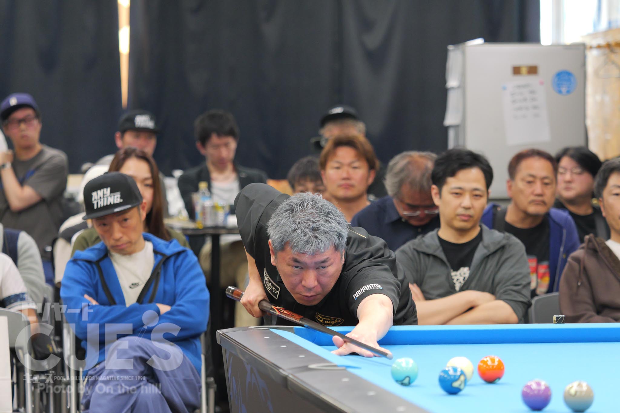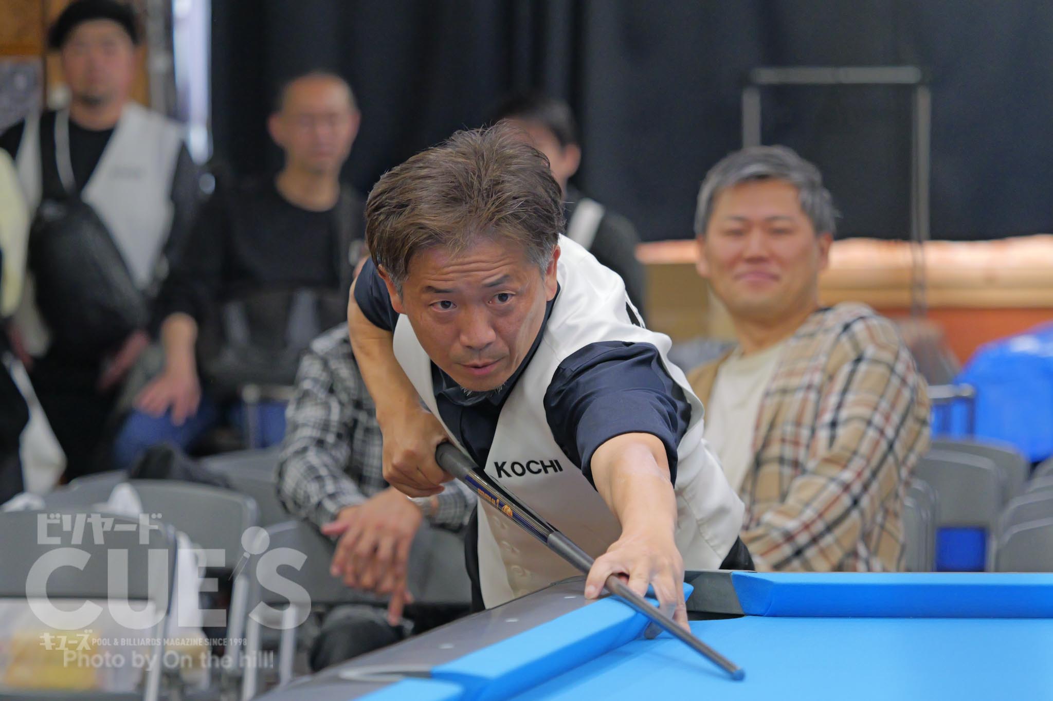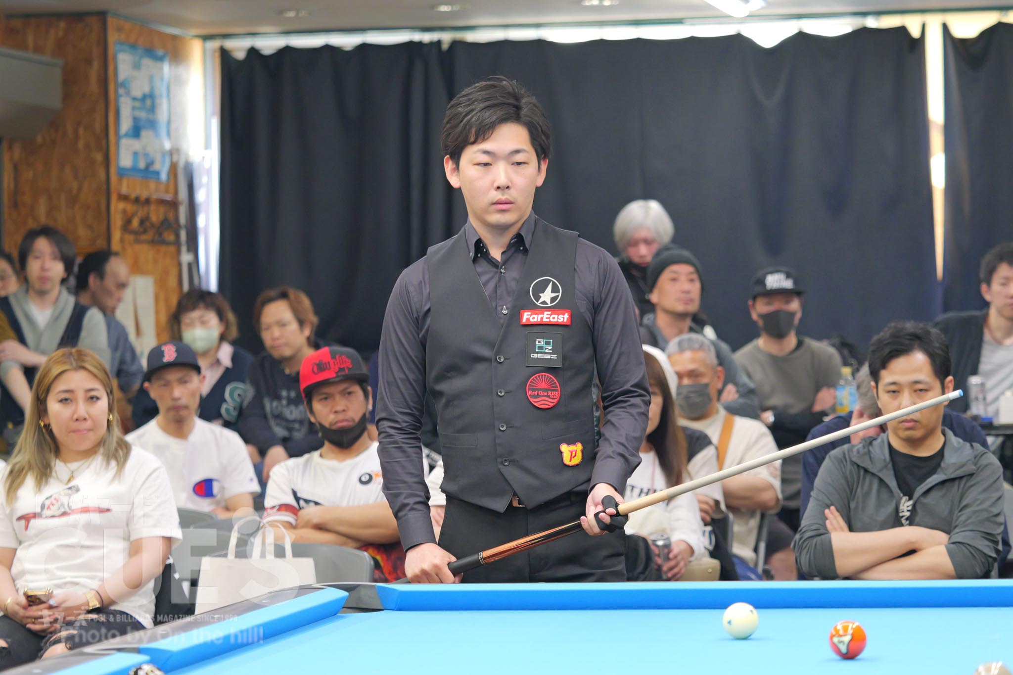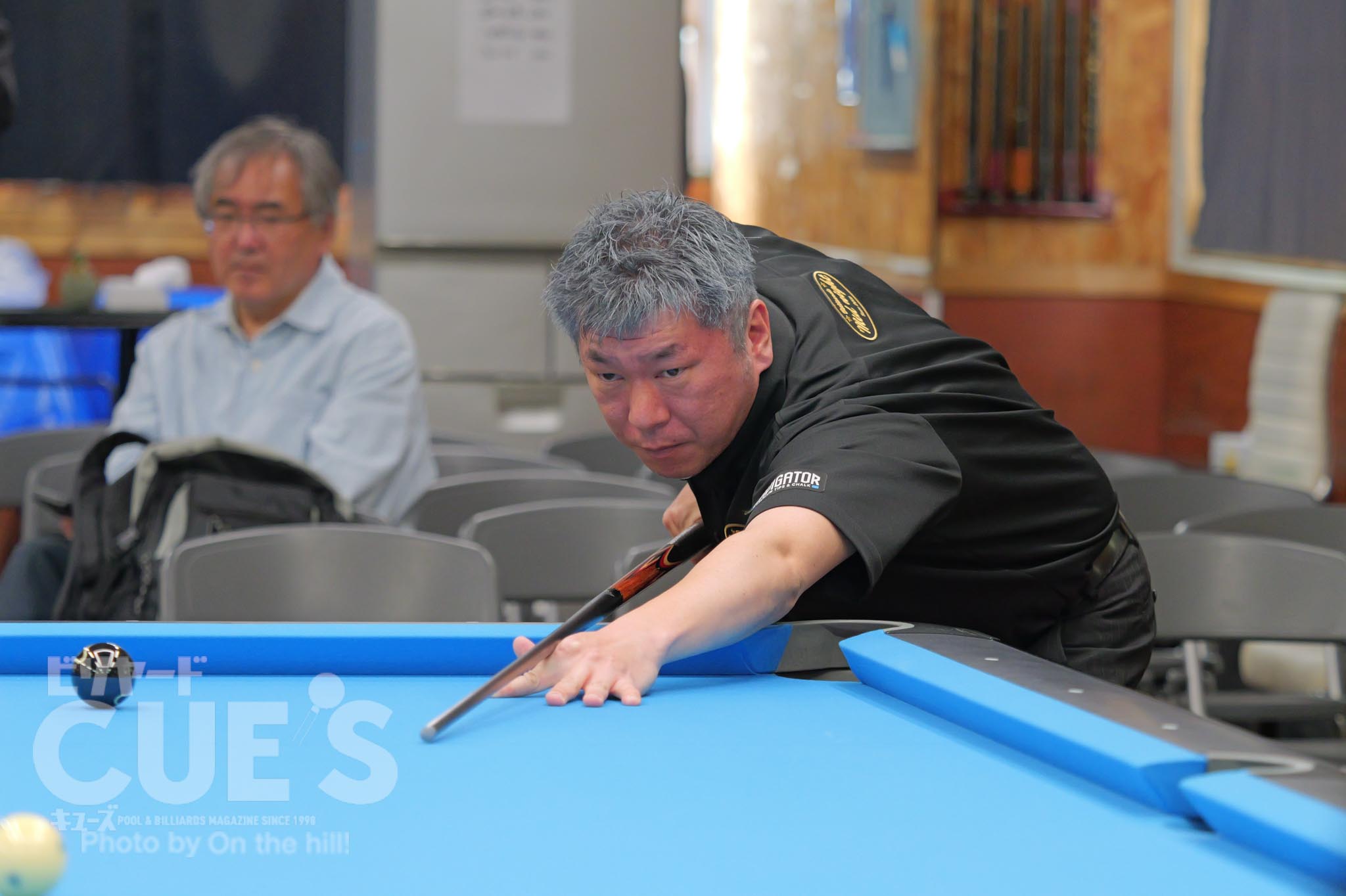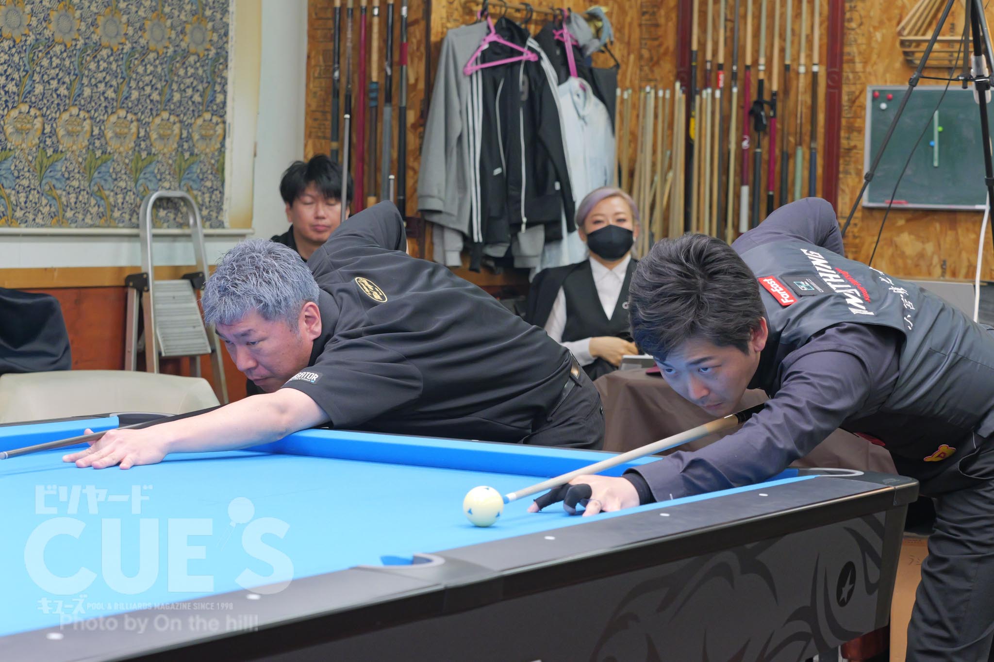 全国レベルの舞台で対戦するのは初めてという両者だったが、以前村井が仕事で高知に行った際、田中の店で撞いたことがあるそうだ。田中には元JPBAプロという肩書きがあり、村井は関東ではよく知られたSAだが、二人ともアマ全国タイトル戦への登場は初めてとなる。挑戦者決定戦は9ボール交互ブレイク3セット先取。1ラックは7先と、普段全くやることがない長丁場の戦いだ。