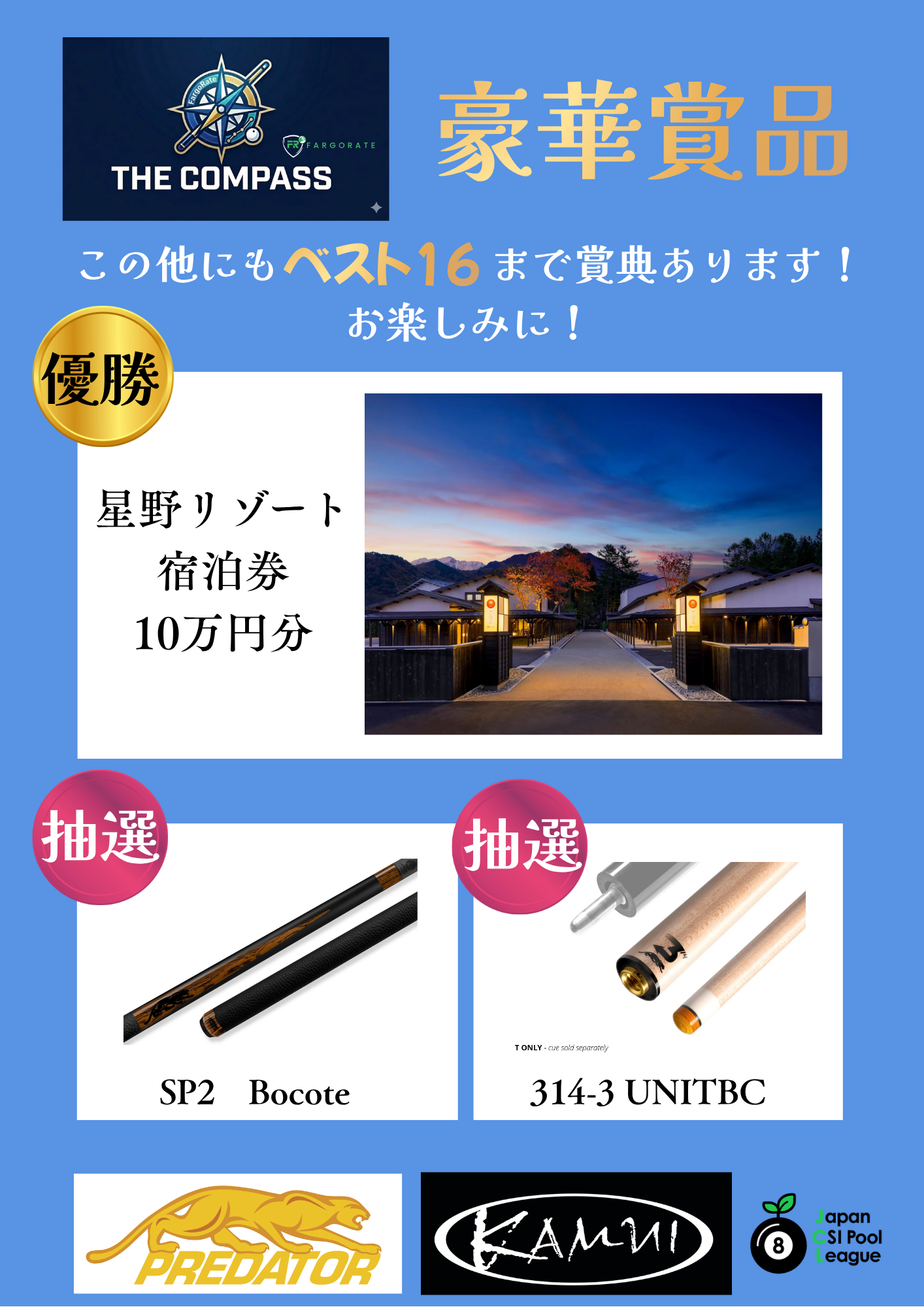 賞典はベスト16まで用意されており、優勝者には「星野リゾート宿泊券(10万円分)」が贈られる。さらに、今回の大会開催の趣旨に賛同したという協賛のプレデタージャパン、カムイ提供のアイテムが当たるお楽しみ抽選会も実施予定だ。