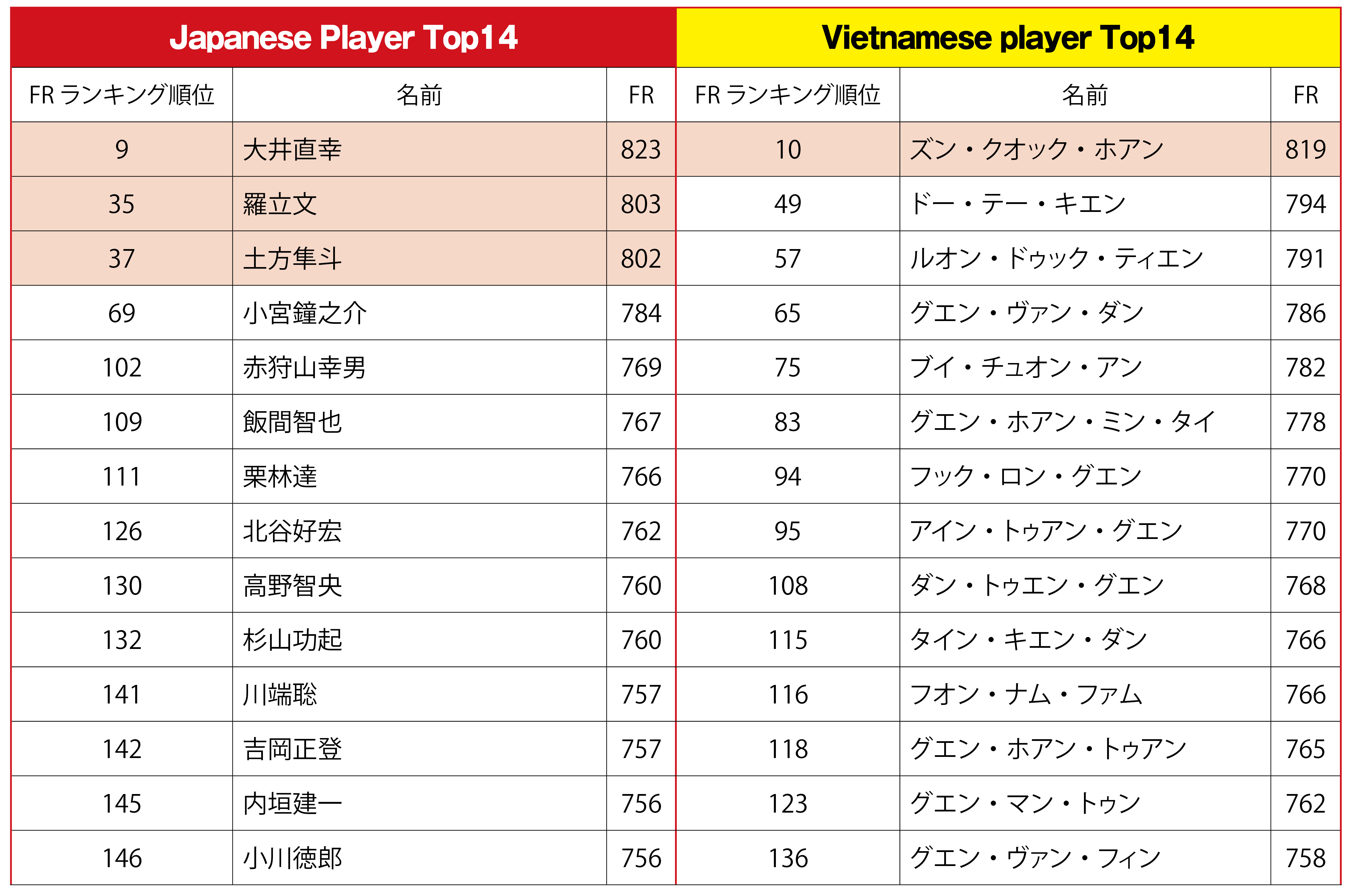 その他、日本と同じく14名をトップ150に送り込んでいるベトナムの躍進にも注目だ。over800はエースのズンのみながら、14名の平均FRは777で、日本の773を上回っている。プールが大きく盛り上がり、トップスターが参戦するインターナショナルトーナメントが盛んに開催されているベトナム、今後さらにプレイヤーレベルが上がっていくことが予想される。