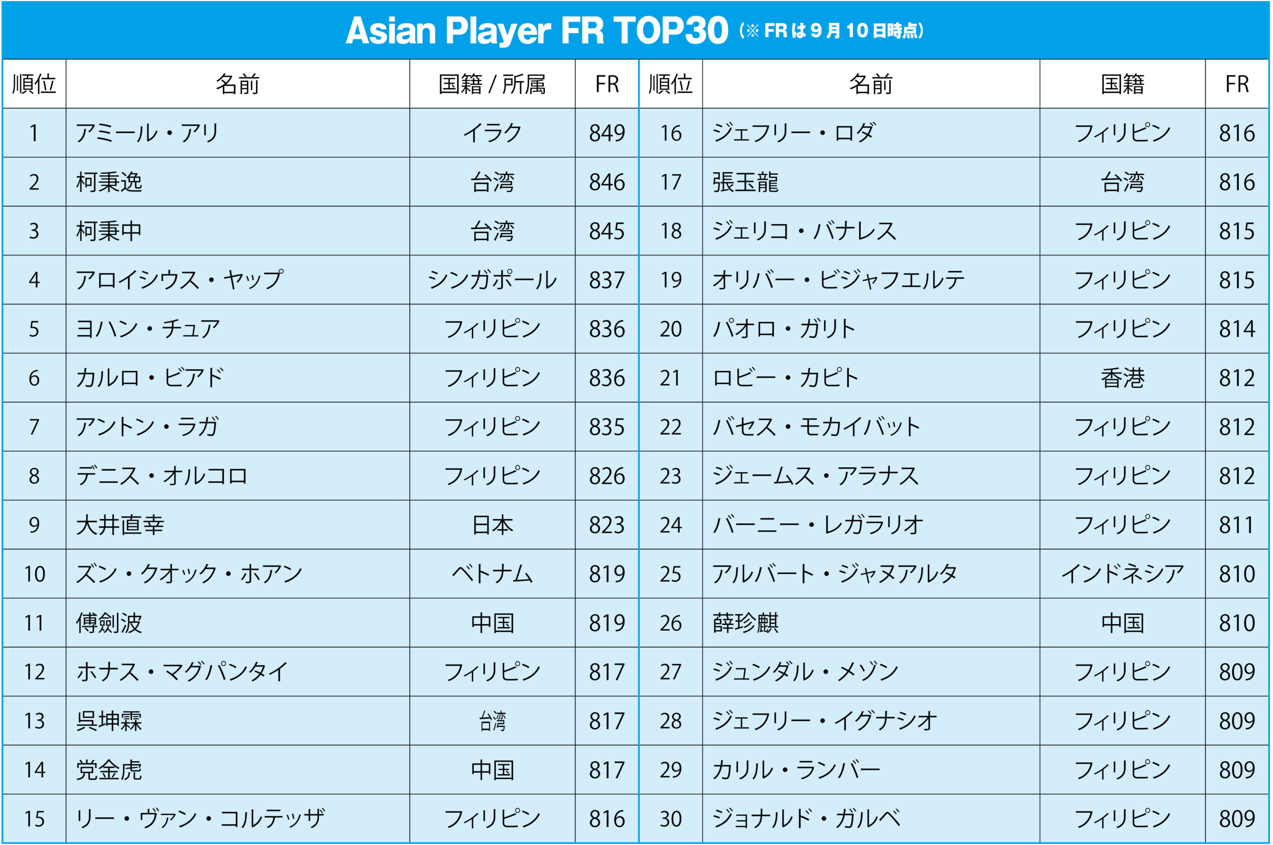 これによると、現在のナンバー1アジアンプレイヤーは、世界ランキングでジョシュア・フィラー(ドイツ/FR:859)に次ぐレーティング849を持つアミール・アリで、まだまだデータが少なく数値も不安定ではあるものの、ファーゴレートも「彼がこのゲームのエリート層に属するという我々の確信は深まっています」とする存在だ。以下トップ10にはフィリピンが4名、台湾は柯秉逸、柯秉中の2名で、残る3名にはそれぞれの国のエース、アロイシウス・ヤップ、大井直幸、ズン・クォック・ホアンが入った。