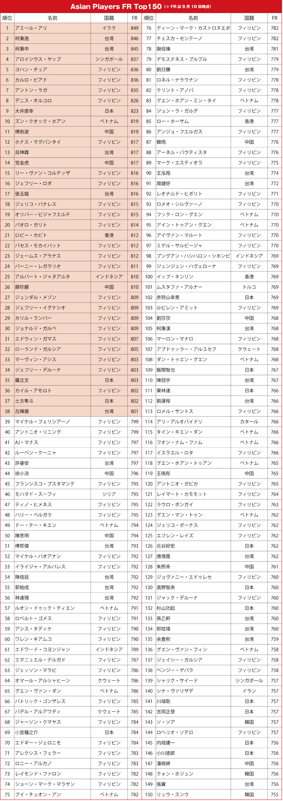 現在アジアにはover800プレイヤーが38名いるが、その内訳を見てみるとフィリピンが22名で、台湾の5名、日本と中国の3名を大きく上回っており、ランキング全体を見てみても、フィリピンプレイヤーが71名と約半数を占めており、22名の台湾、14名の日本とベトナムを抑え、最強国の層の厚さを見せつける格好となっている(日本語版トップ150ランキングはこちら)。