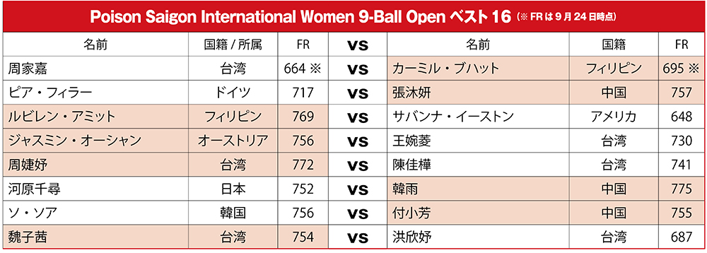 9月20日(土)にスタートしたWPAランキングイベントで賞金総額75,000ドル、優勝賞金22,500ドルの『Poison Saigon International Women 9-Ball Open』(サイゴン女子ナインボールオープン)。24日(水)の大会5日目は日本時間15時から決勝トーナメント1回戦(ベスト16戦)が行われ、JPBA女子勢で唯一ここに勝ち残っていた河原千尋(FR:752)は韓雨(中国/FR:775)との激闘に敗れ9位タイで今大会を終えた。