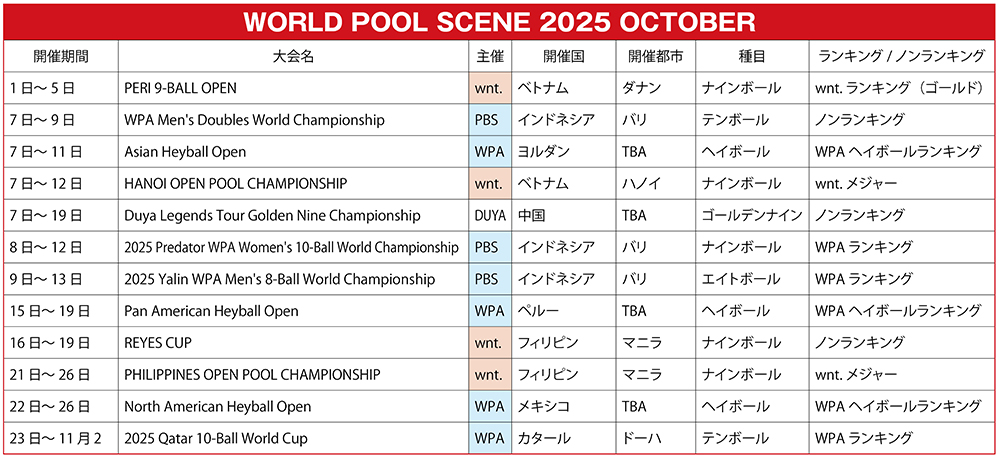 そして、ペリオープン終了2日後の7日(火)からはハノイを舞台にwnt.メジャー『HANOI OPEN POOL CHAMPIONSHIP』(ハノイオープン)が行われるが、この大会は10月9日〜13日の日程でインドネシア・バリで行われる『2025 Yalin WPA Men’s 8-Ball World Championship』(男子エイトボール世界選手権)とほぼ日程が重なっている。