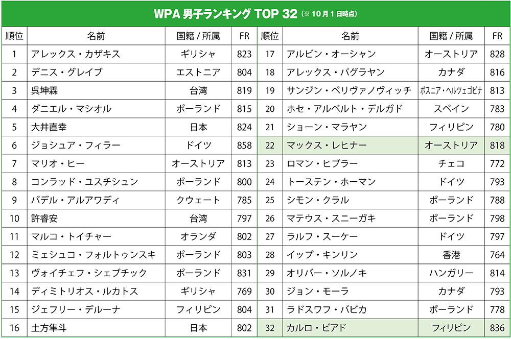 現在のWPAランキングTOP32は上の通りとなっており、この中では22位のマックス・レヒナーと32位のカルロ・ビアドの2名だけがハノイオープンを選択、その他ランキング5位の大井直幸と16位の土方隼斗を含めた30名が出場を見送っている。
