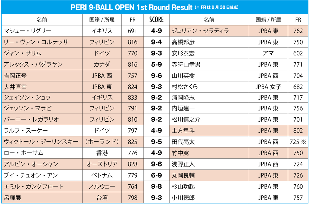 日本から参戦している18名の1回戦の結果は上の通りとなっており、2回戦に進んだ大井がジェームズ・アラナス(フィリピン)、土方が王泓翔(台湾/FR:777)、セラディラがロビー・カピト(香港)、吉岡がムスタファ・アルナー(トルコ/FR:769)、竹中がダビッド・アルカイデ(スペイン)、丸岡がアルセニー・セヴァスティアノ(フィンランド/FR:不明)と対戦中で、敗者側に回った12名は20時からの敗者側1回戦で生き残りをかけた戦いに臨む。
