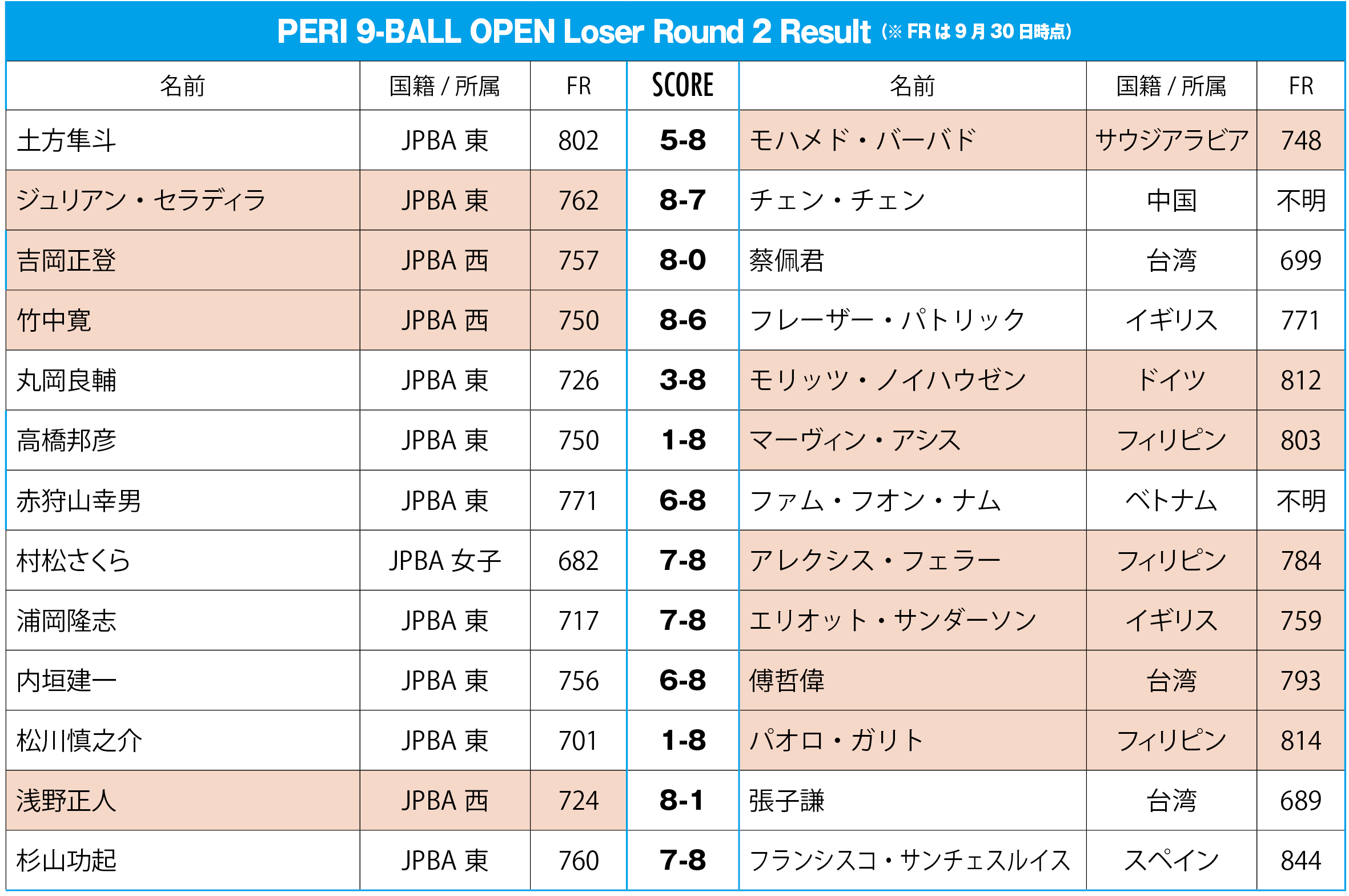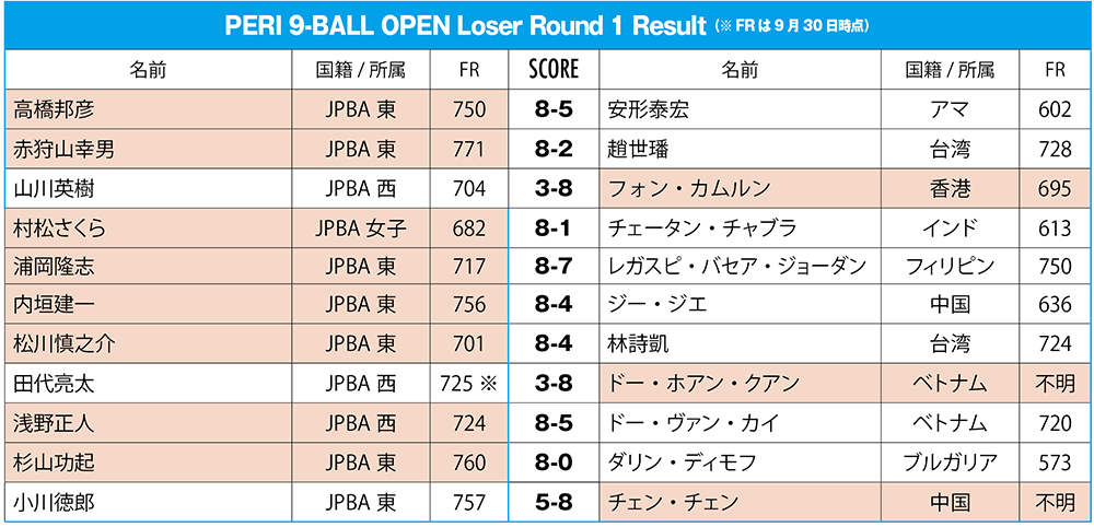 10月2日(木)にスタートした賞金総額20万ドル、優勝賞金は40,000ドルのwnt.ランキングイベント(ゴールド)『PERI 9-BALL OPEN』(ペリオープン)。大会初日に256名によるダブルイリミネーションの予選ラウンド1回戦と2回戦(敗者側1回戦)、さらに敗者側1回戦までが行われ、この大会に日本から出場している『日本プロポケットビリヤード連盟』(JPBA)所属プロ17名とアマ1名の計18名もベスト64進出を目指す戦いに臨んだ。