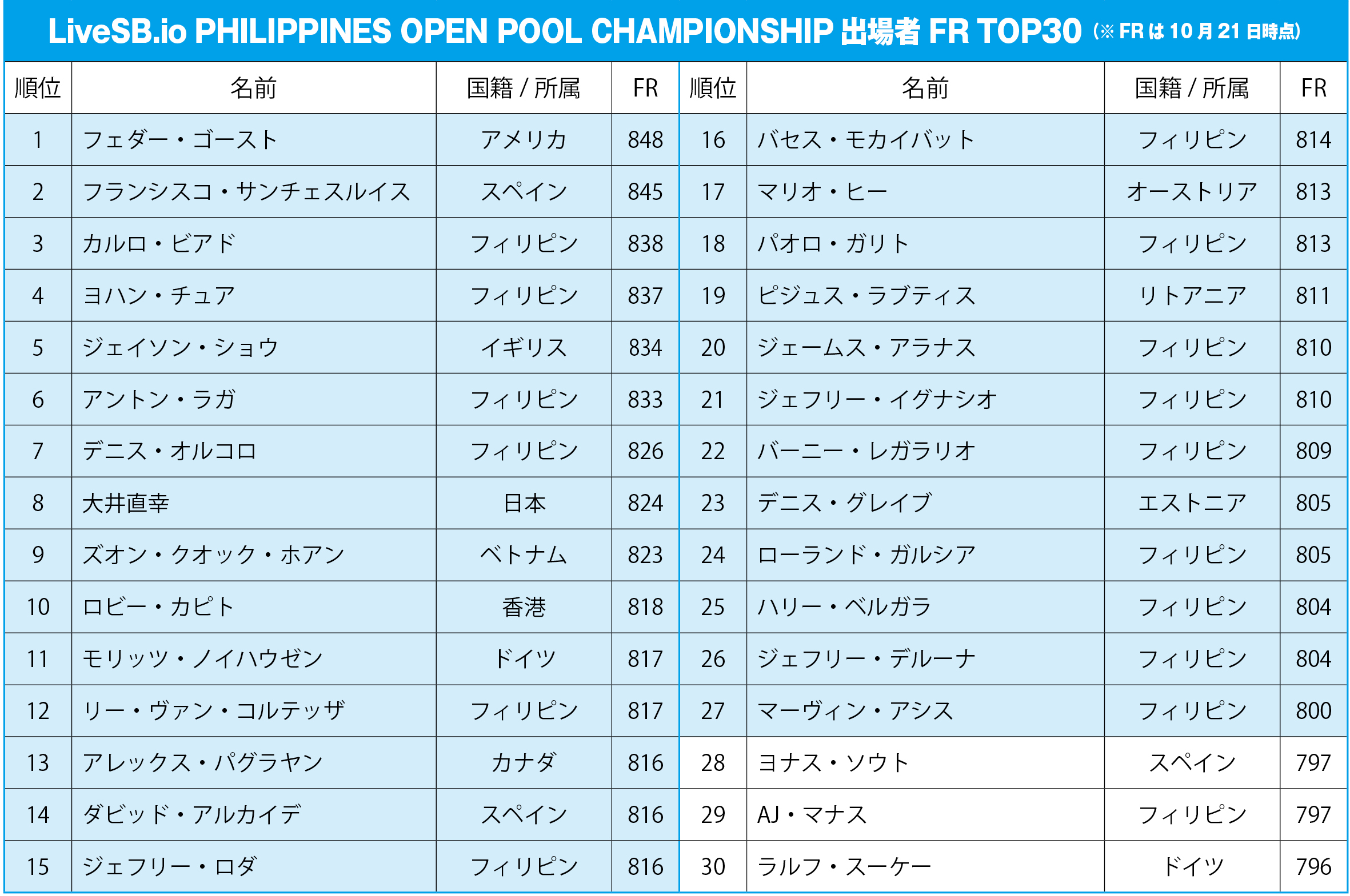 この大会には、19日(日)まで行われていた『LiveSB.io REYES CUP』(レイズカップ)に出場していたwnt.ランキング1位のフェダー・ゴースト(アメリカ/FR:848)を始めとしたトップランカーを筆頭に、開催国フィリピンからは85名が出場。その中には2人のレジェンド、エフレン・レイズ(FR:763)、フランシスコ・ブスタマンテ(FR:796)、さらには久々のプールトーナメント出場となるデニス・オルコロ(FR:826)の名前もある。