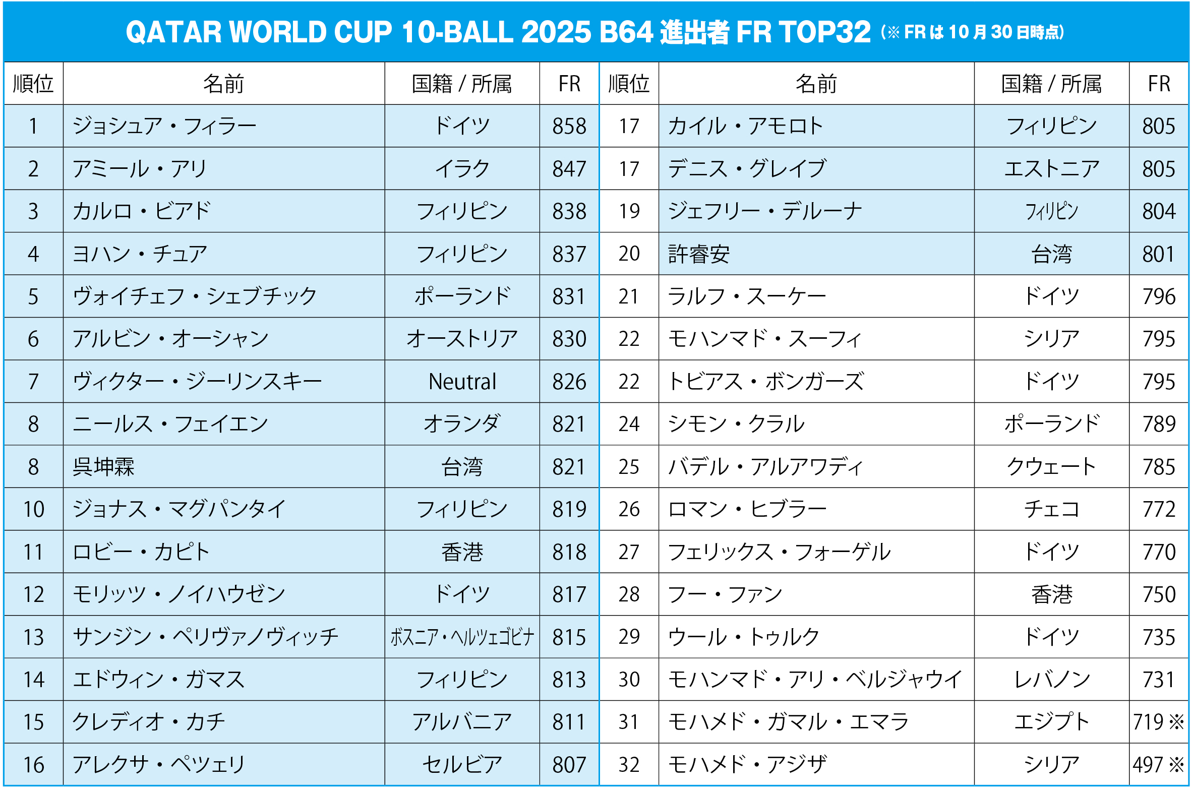 今大会には『日本プロポケットビリヤード連盟』(JPBA)から土方隼斗(FR:805)、大井直幸(FR:824)、赤狩山幸男(FR:767)、ジュリアン・セラディラ(FR:764)の4名が出場。