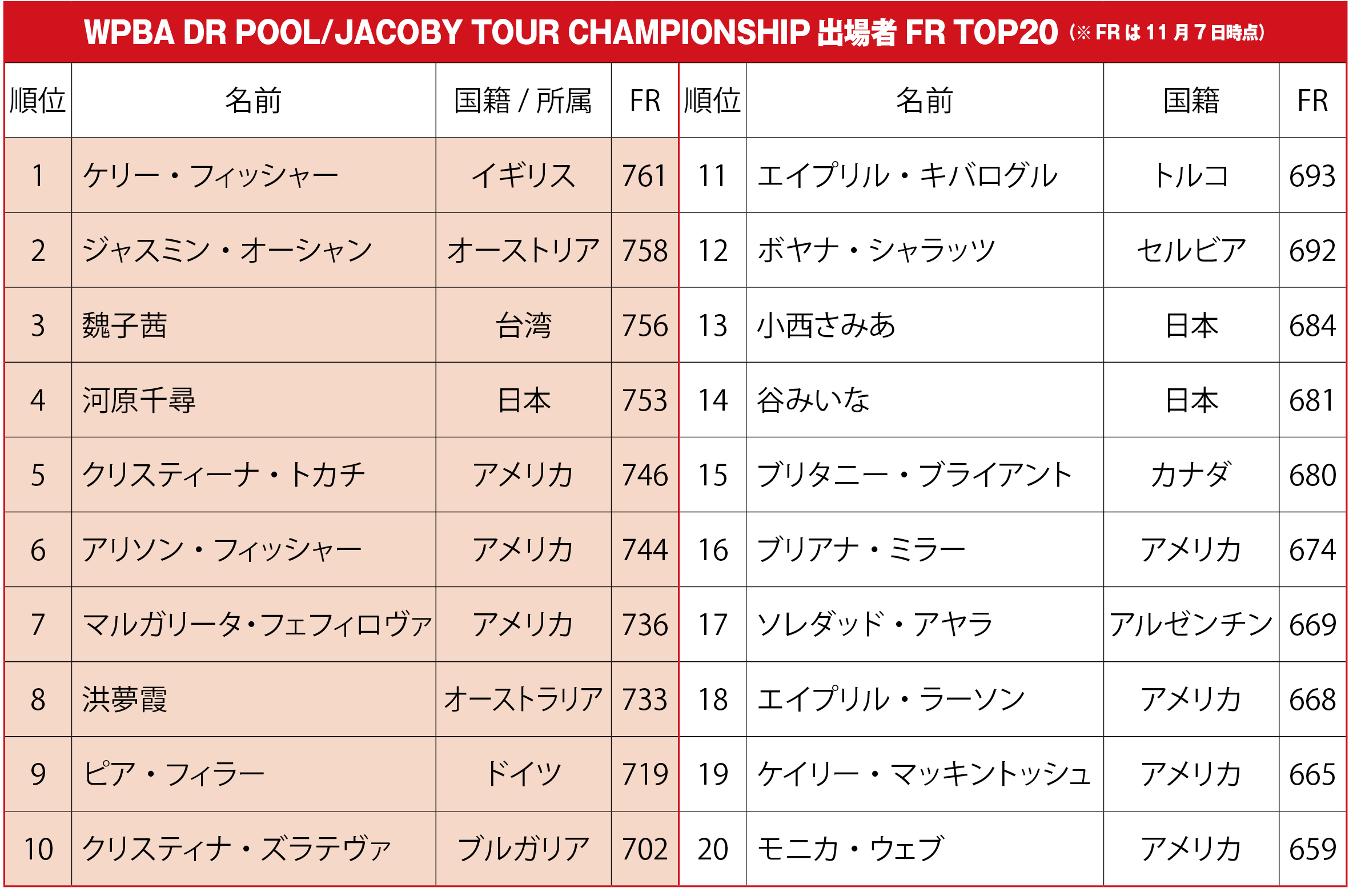 世界のトップ女子が集まるハイレベルなトーナメントであり、WPAランキング対象試合ともなっている今大会に、『日本プロポケットビリヤード連盟』(JPBA)から9月末時点のJPBA女子ランキング1位の河原千尋(FR:753)、同3位の小西さみあ(FR:684)、6位の谷みいな(FR:681)の3選手が出場する。
