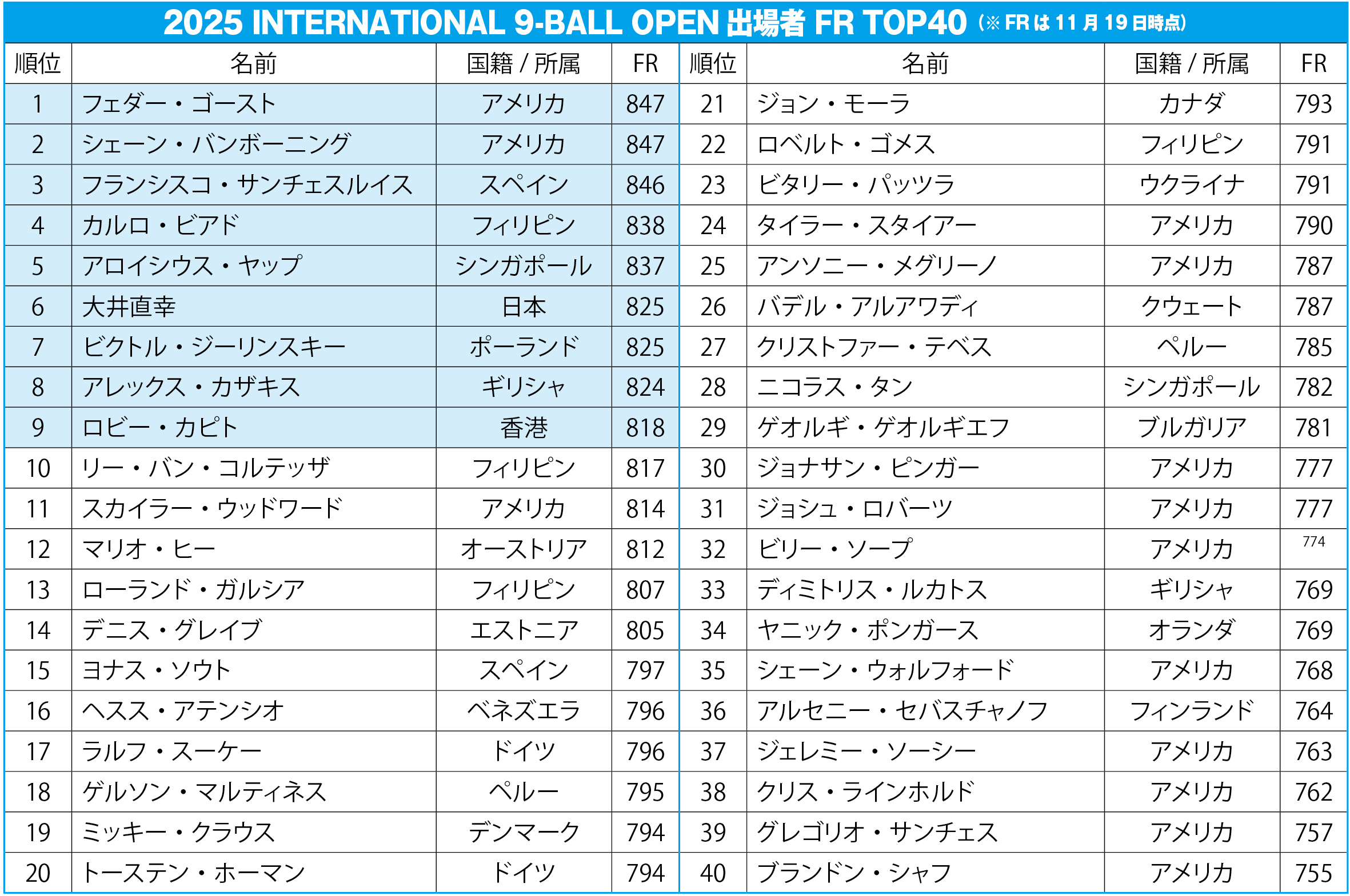 この大会にはwnt.ランキング1位のフェダー・ゴースト(アメリカ/FR:847)を筆頭に、アメリカのエース、シェーン・バンボーニング(FR:847)、現ナインボール世界王者のカルロ・ビアド(FR:838)、さらにフランシスコ・サンチェスルイス(FR:846)、アロイシウス・ヤップ(FR:837)といったワールドトップスターを含めた105名が出場。日本からは『日本プロポケットビリヤード連盟』(JPBA)所属でwnt.プロでもある大井直幸が参戦。