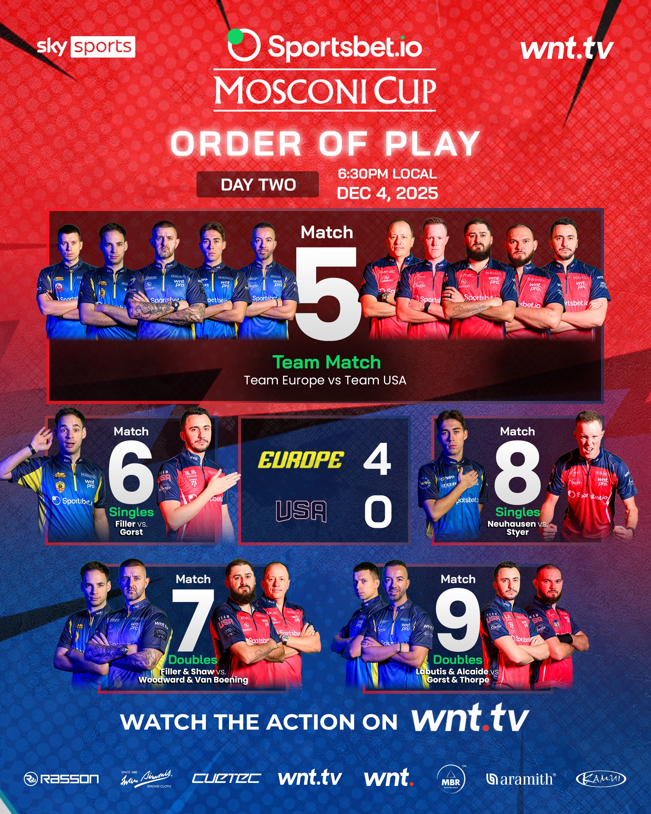 現地12月3日(水)にイギリス・ロンドンの『アレクサンドラパレス』を舞台にスタートしたアメリカ vs ヨーロッパによる5対5のチーム対抗戦『2025 Sportsbet.io Mosconi Cup』(モスコーニカップ)。4日(木)に大会2日目の3試合が行われ、大会初日を4-0で終えていたヨーロッパが、2勝1敗として6-1とさらにリードを広げた。
