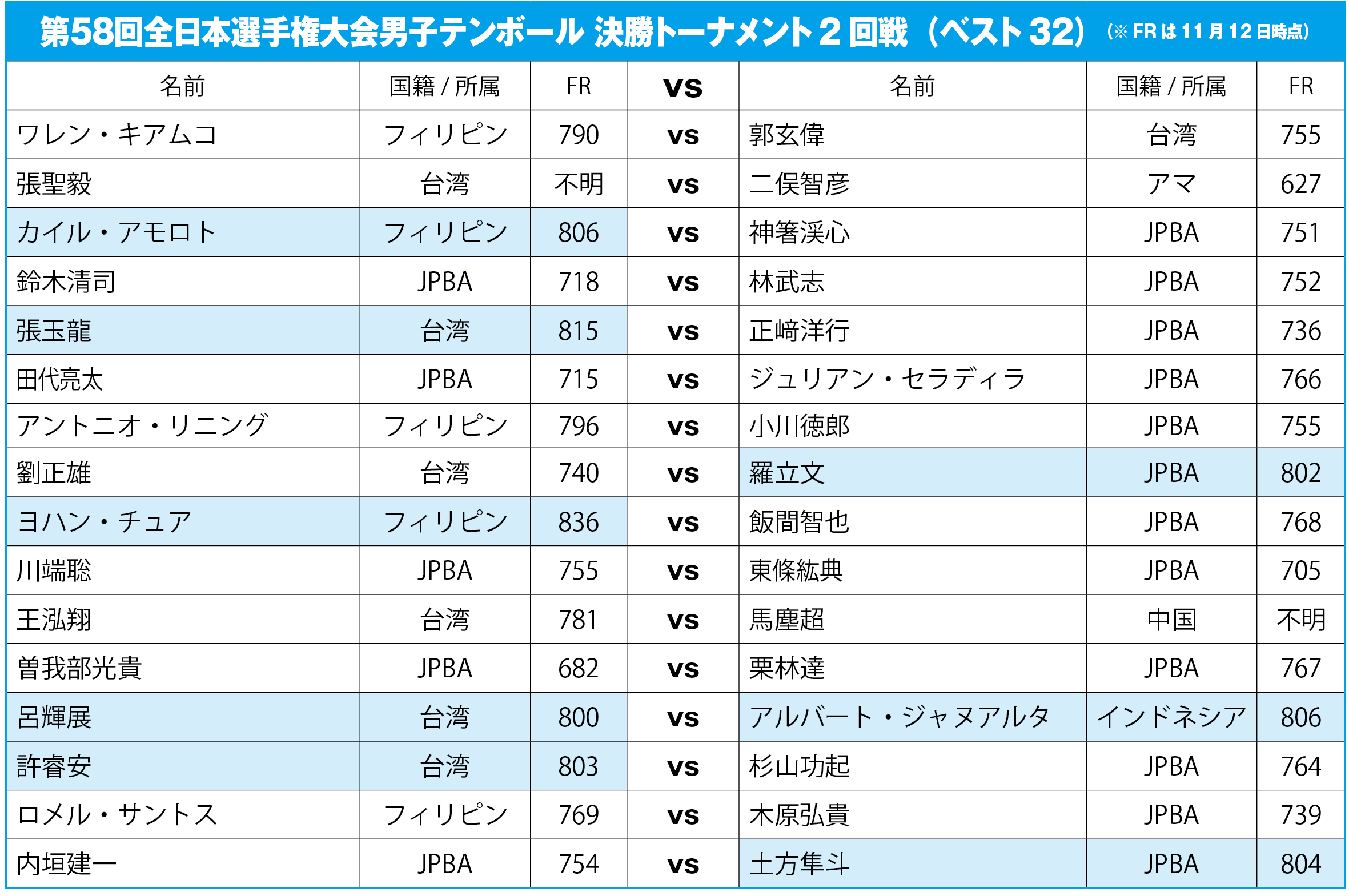 まず20日には1回戦32試合中の16試合が行われ、JPBA男子ランキング2位の羅立文(FR:802)を筆頭にJPBA勢が8名、アマ1名、海外勢1名が2回戦(ベスト32戦)に進出。その後21日14時から行われた16試合からは、ランキングトップの土方隼斗(FR:804)、ランキング3位の杉山功起(FR:764)を含むJPBA勢9名、ヨハン・チュア(フィリピン/FR:836)、アルバート・ジャヌアルタ(インドネシア/FR:806)ら海外勢7名が勝ち上がった。