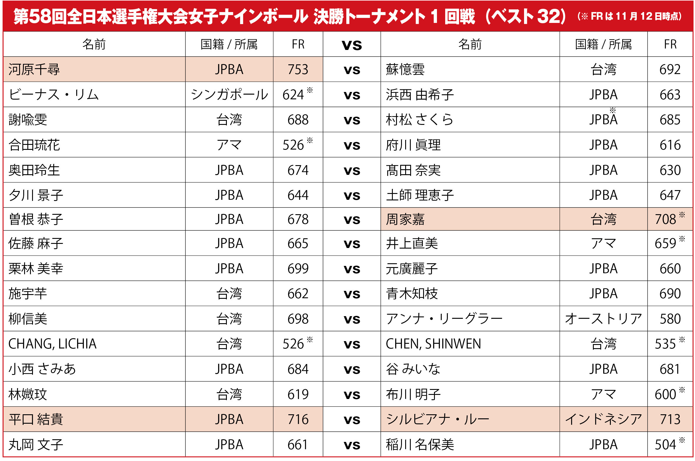 まず21日(金)の最終回転で2回戦(勝者側最終戦)が行われ、ここからは河原千尋(FR:753)、栗林美幸(FR:699)のJPBA女子ランキングトップ2だけでなく、3位の平口結貴(FR:716)、4位:奥田玲生(FR:674)、5位:小西さみあ(FR:684)が揃って勝利しベスト32進出。また1回戦でランキング7位の久保田知子(FR:662)を下して2回戦に進んでいたジュニアプレイヤー、合田琉花アマ(FR:526※信頼性不足)が、2回戦でアンナ・リーグラー(オーストリア/FR:580)を下して決勝トーナメントに進んだ。