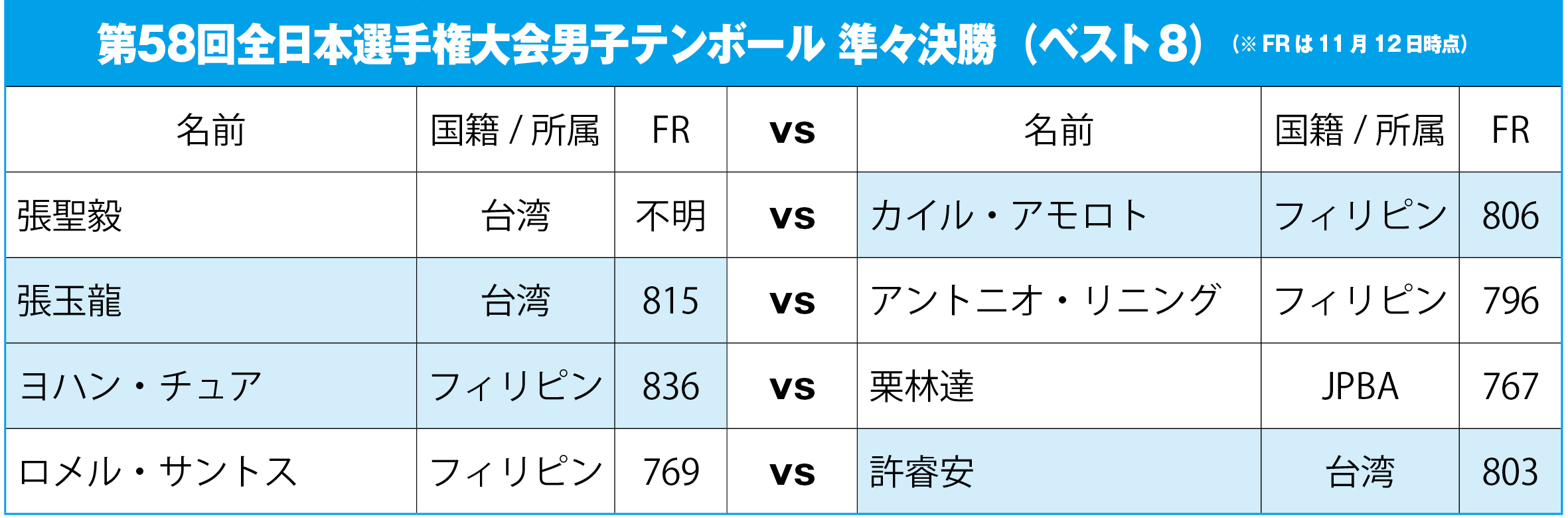 まず男子テンボールの組み合わせは以下の通りで、22日(土)の最終回転の決勝トーナメント3回戦(ベスト16戦)は、海外勢11名対JPBA勢5名の戦いとなりJPBA男子ランキング1位の土方隼斗(FR:804)を始め4名が敗退。しかしランキング12位の栗林達(FR:767)が自身初となる全日本選手権制覇を目指して今日の戦いに臨む。
