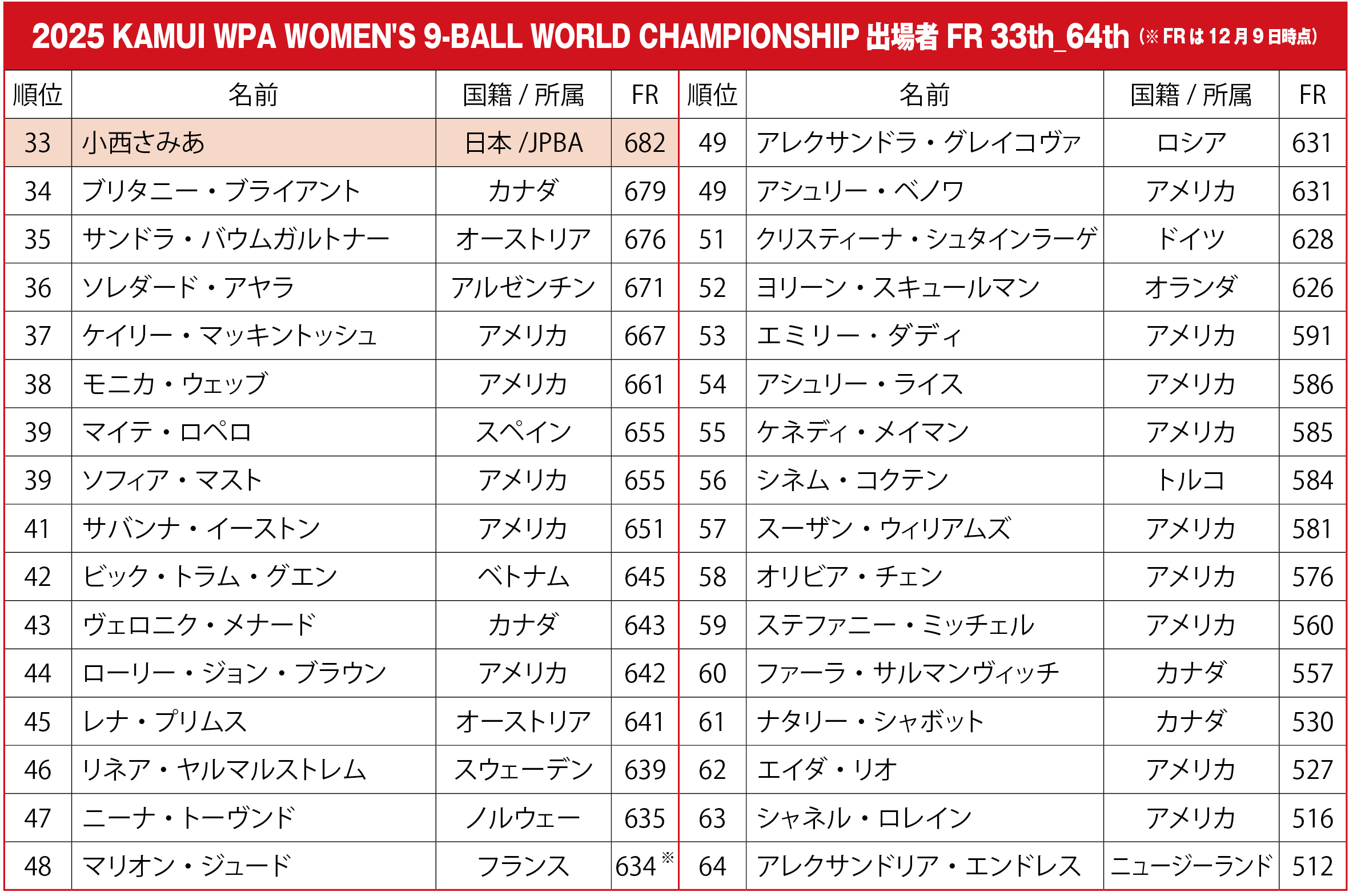 12月7日(日)に小西さみあのランキング対象公式戦2連勝で幕を閉じた『全日本女子プロツアー第3戦』に続き、18日〜21日(木〜日)、アメリカ・フロリダ州を舞台にしたWPA公認の世界タイトル戦『2025 KAMUI WPA WOMEN’S 9-BALL WORLD CHAMPIONSHIP』(女子ナインボール世界選手権)が開幕する。
