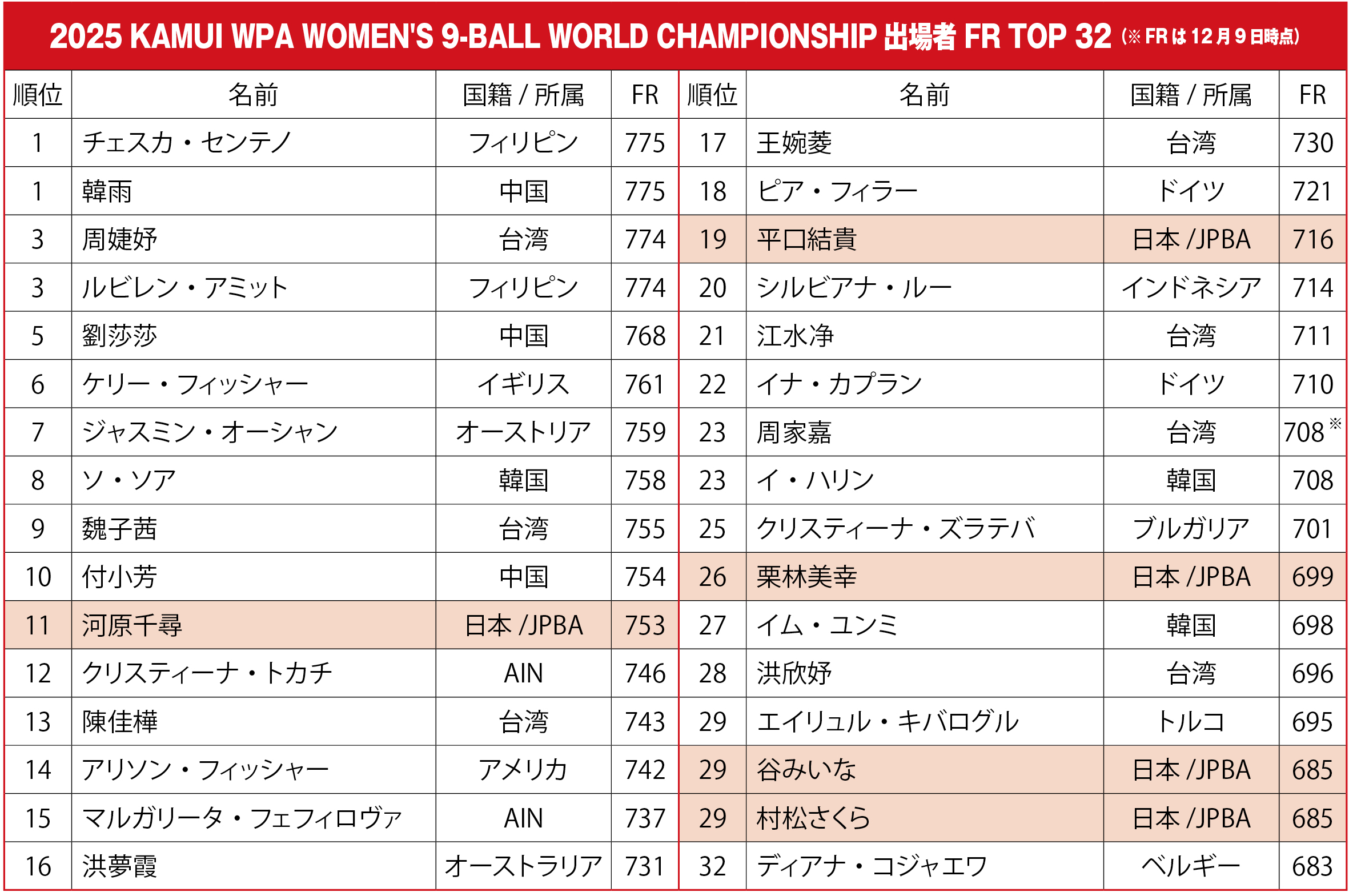 地元アメリカから参戦の15名を含む世界28ヵ国(※AIN【中立的立場の個人資格選手】は除く)、64名が出場する今年最後の世界選手権には、『日本プロポケットビリヤード連盟』(JPBA)からも、河原千尋、栗林美幸、平口結貴、小西さみあ、谷みいな、村松さくらの6名が参戦する。