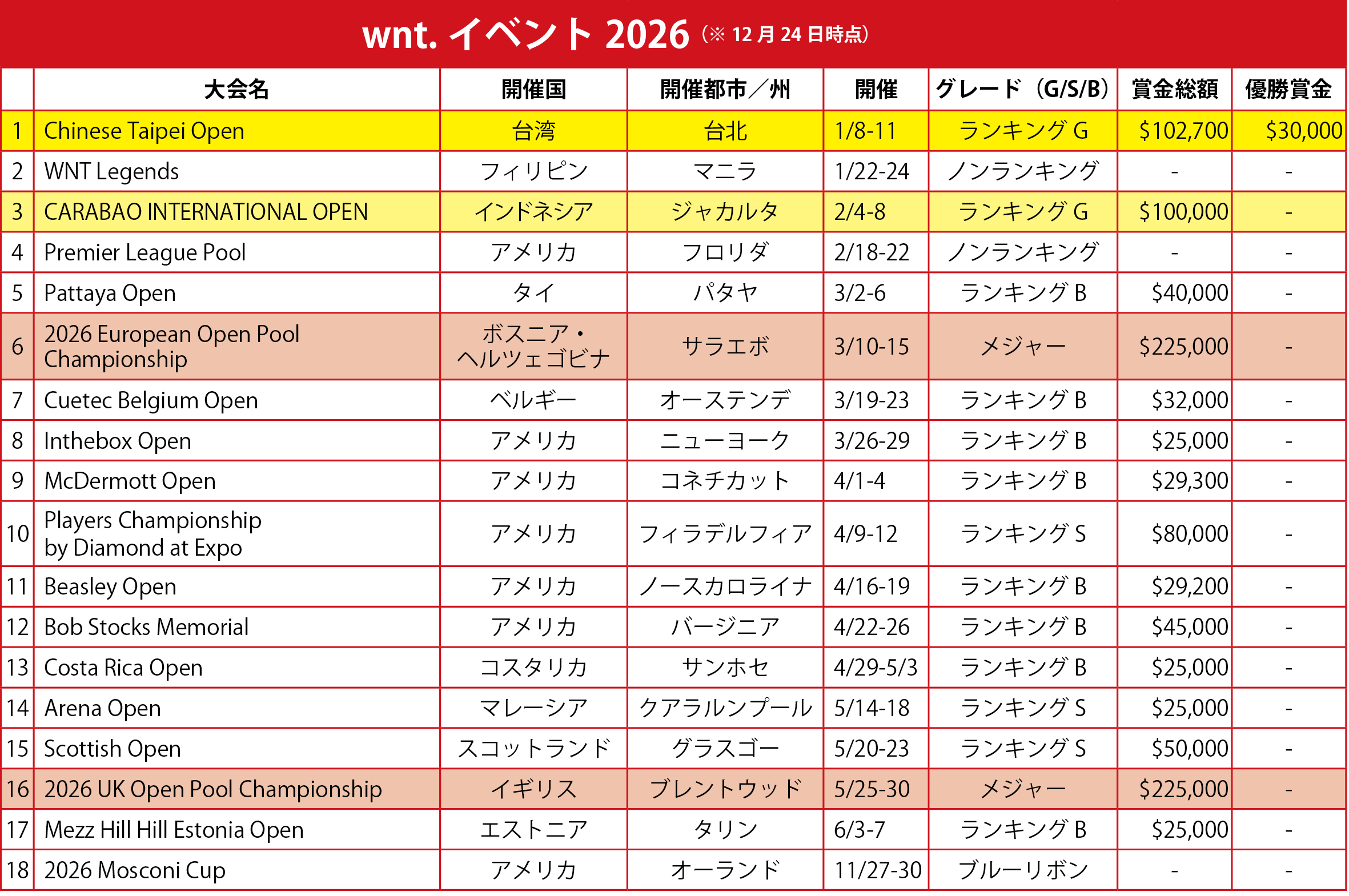 2025年、世界最高峰のナインボールツアーとして、優勝賞金25万ドルの『WORLD POOL CHAMPIONSHIP』(ナインボール世界選手権』を筆頭に25のランキングイベントを開催しワールドプールシーンを大きく盛り上げたwnt.が、先ごろ2026年1月〜7月までのスケジュールを発表(※12月の『Mosconi Cup』も含む)した。