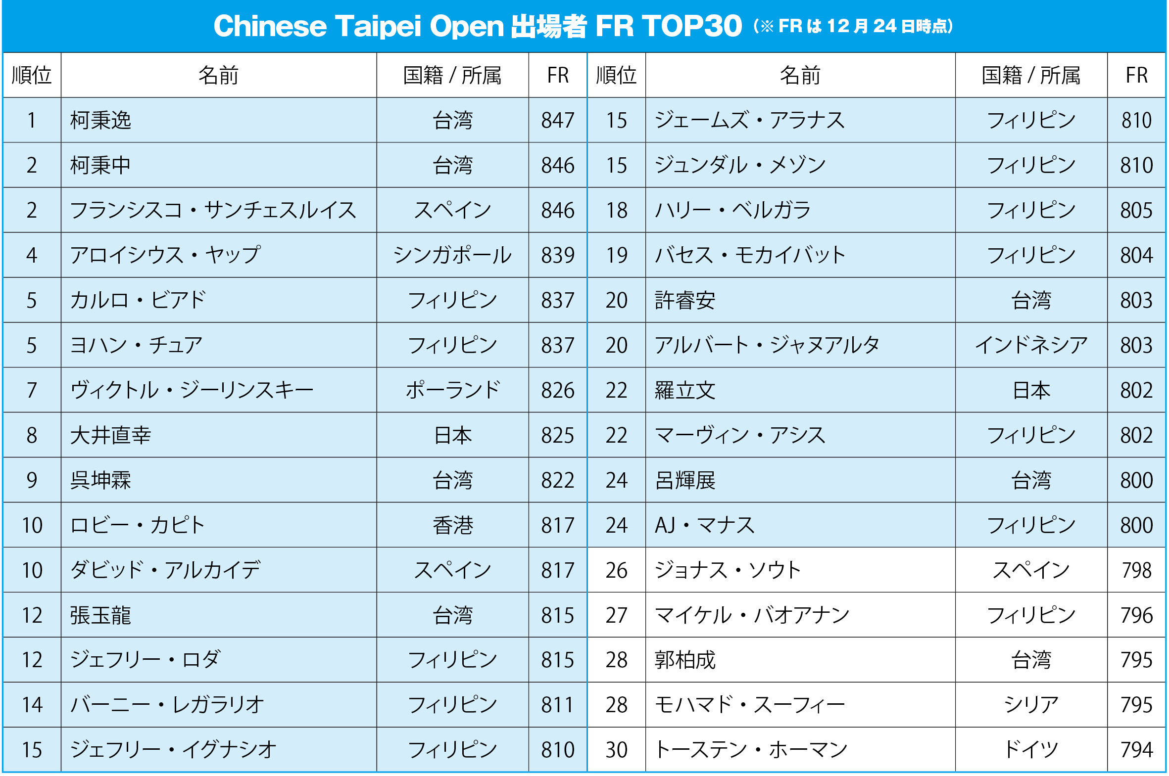 その開幕戦となるのが1月8日〜11日(木〜日)の4日間の日程で台湾・台北を舞台に開催される『4th UNIVERSAL CHINESE TAIPEI OPEN』。wnt.ランキングイベントの中でメジャーの次にグレードの高い、賞金総額102,700ドル、優勝賞金30,000ドル、「ランキングゴールド」のこの大会は128名で争われるが、24日の時点で、5日〜6日(月〜火)に行われる予選・ステージ1から勝ち上がる16名を除いた112名が確定している。