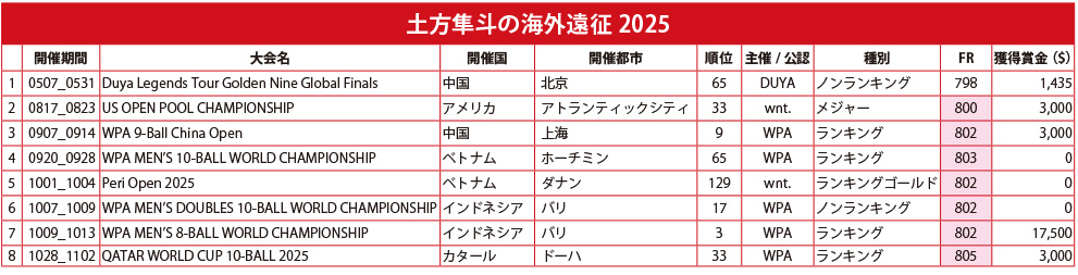 土方:2024年に海外戦で戦績を残すことができてWPAランキングが13位まで上がってWPAシードも受けられる状態だったので、WPAの試合を中心に参戦して、ランキングをキープしていくこと、その流れの中でもちろん海外のメジャートーナメントでの優勝を目指すことを目標にしていました。
