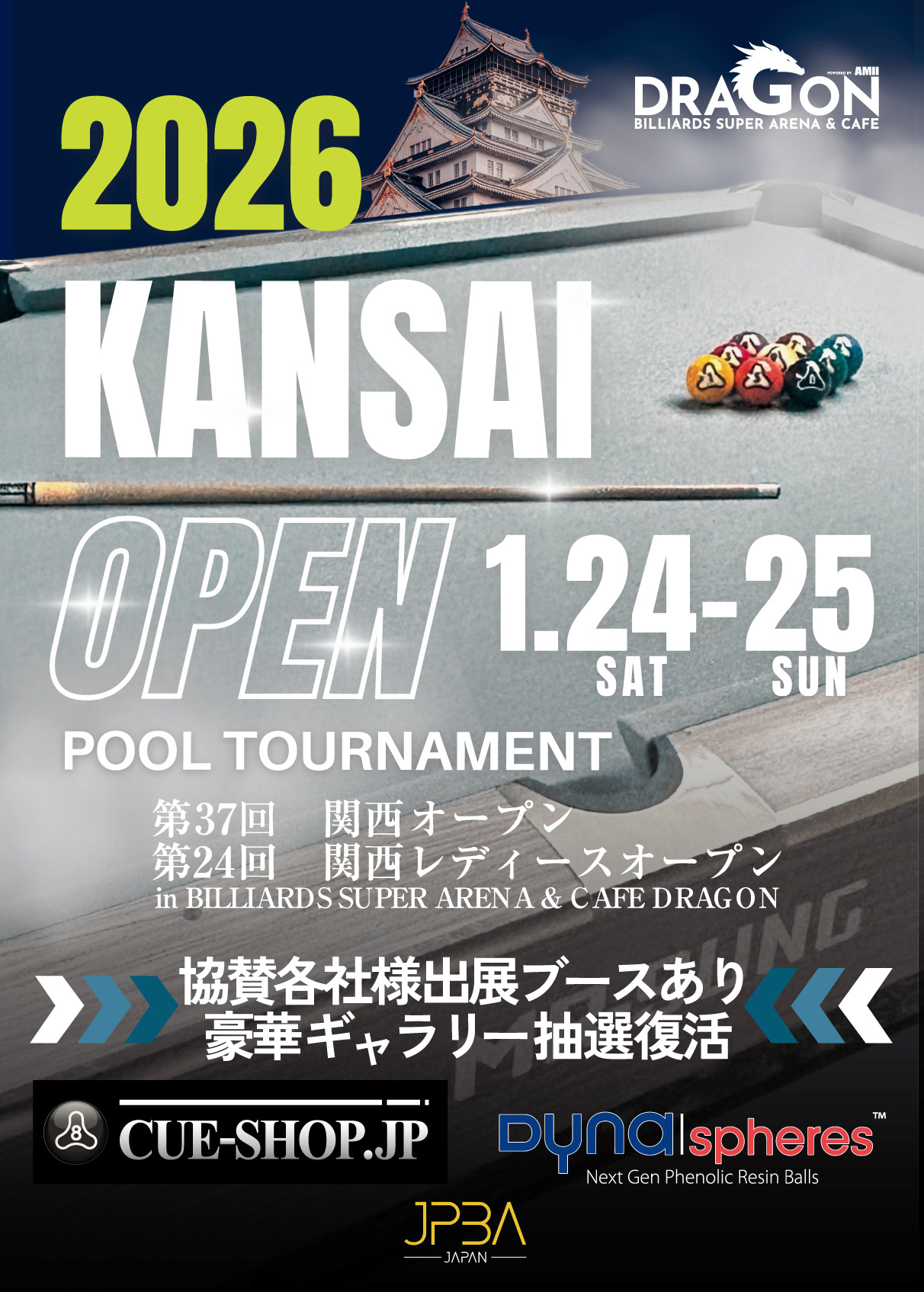 『日本プロポケットビリヤード連盟』(JPBA)の2026年シーズン開幕戦となる『第37回関西オープン(G2)』と『第24回関西レディースオープン(G2)』が、明日24日〜25日(土・日)の2日間に渡って開催される。
