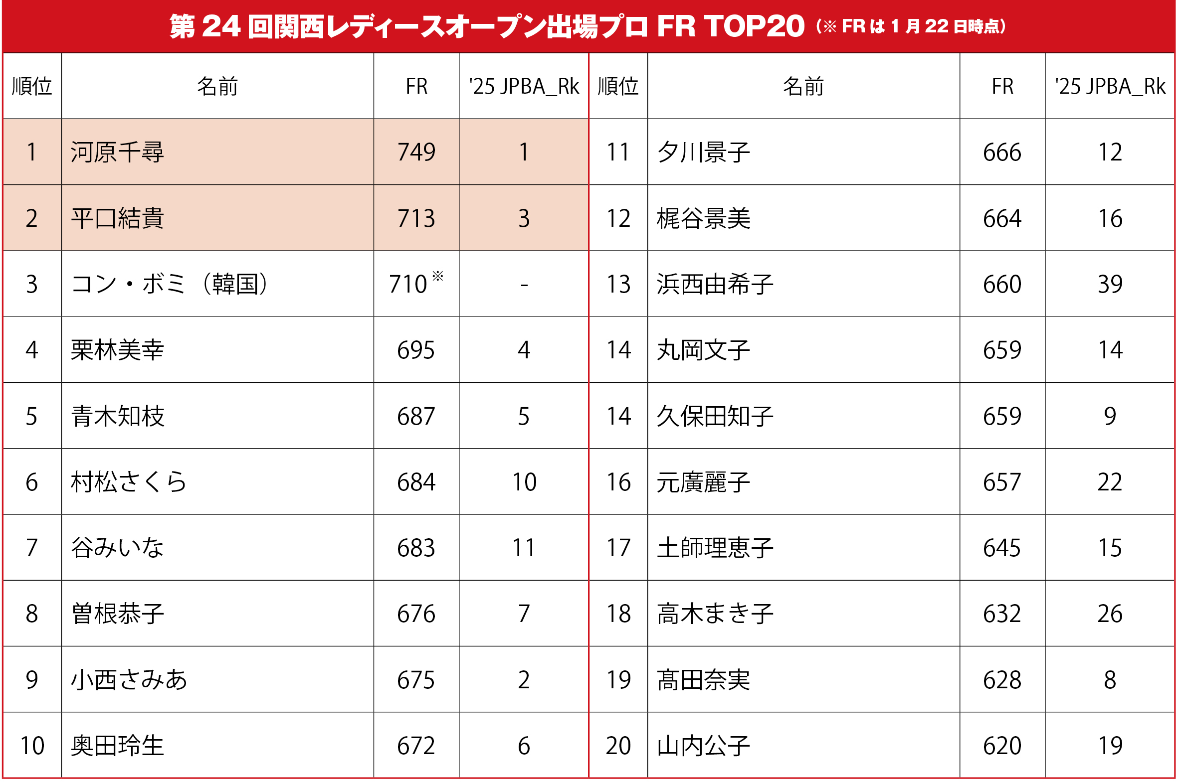 一方の女子・関西レディースオープンにはプロ36名(韓国2名を含む)、アマ32名の計68名が出場。昨年大会を制した韓国のソ・ソア(FR:759)が今年は不参加ながら、前週に開催された『BLUEROSE CUP 2nd』でチーム韓国のメンバーだった、コン・ボミ、ソン・ナキュン(FR:583※信頼性不足)が参戦。これを、土方と同じく2025年に3年連続女子MVPとなった河原千尋、昨年自身初の全日本選手権制覇を果たした2位の小西さみあ、3位・平口結貴、4位・栗林美幸、5位・青木知枝のトップ5を中心としたJPBA勢が迎え撃つ形となっている。