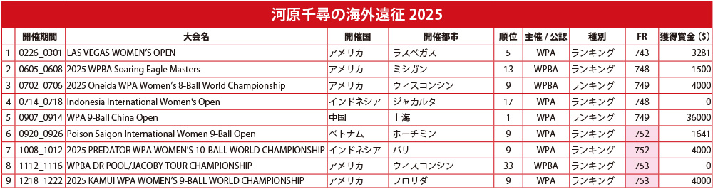 第2回は2025年の海外参戦について。WPAランキング上昇を目標に掲げ、アメリカ、そして世界へと飛び出した河原プロ。PBSのシュートアウト、WPBAの完全ダブルイリミネーションなど、日本とは異なるタフな環境やフォーマットで世界の強豪と渡り合う中で変化していった心境と、確かな手応えに迫る。
