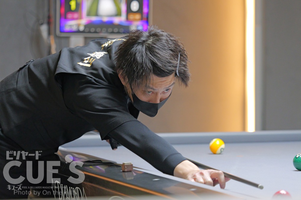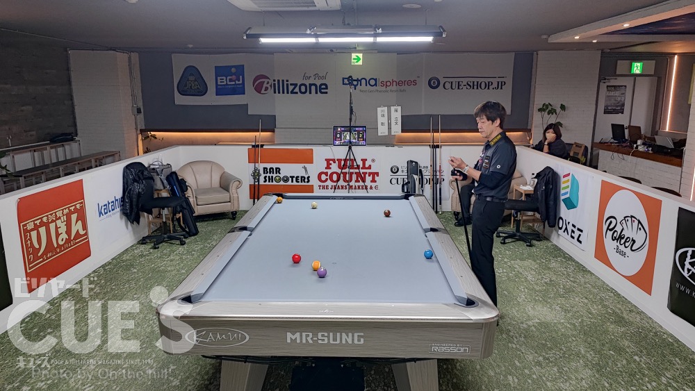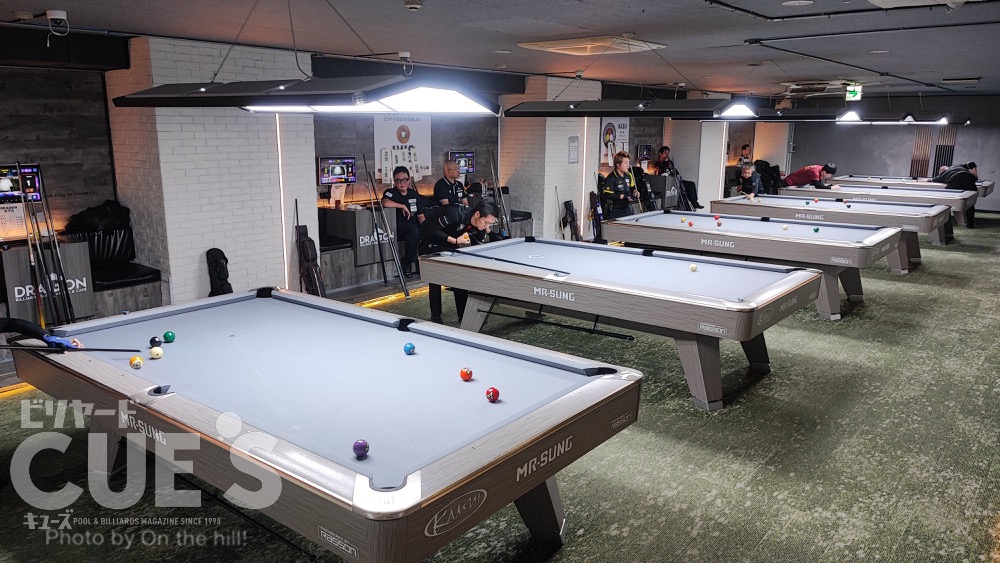 今回初めて決勝会場となった大阪市東成区の『DRAGON』はジャパンオープン2勝の飯間智也の所属店。テーブル8台のうち2台はギャラリー席で周囲を囲まれ、観戦するにも、またライブ配信をするにも良好な環境だ。ただしコーナーポケット開口部でボール1.8個未満と、決してイージーなテーブルコンディションではない。