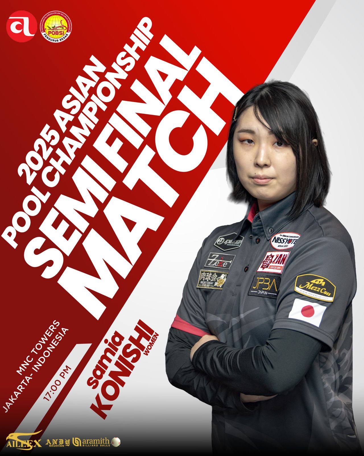 ここまで地元インドネシア勢との激戦を制して平口と同じく準決勝に臨んだ小西さみあ(FR:675)は、予選ラウンドで一度コンスタンティノに敗れたものの、決勝トーナメントに入り準々決勝では昨年の女子ナインボール世界選手権チャンピオンであるソ・ソア(韓国/FR:759)を下すなど素晴らしいプレーを見せている江水浄(台湾/FR:709)に3-7で敗れ大会終了となった。