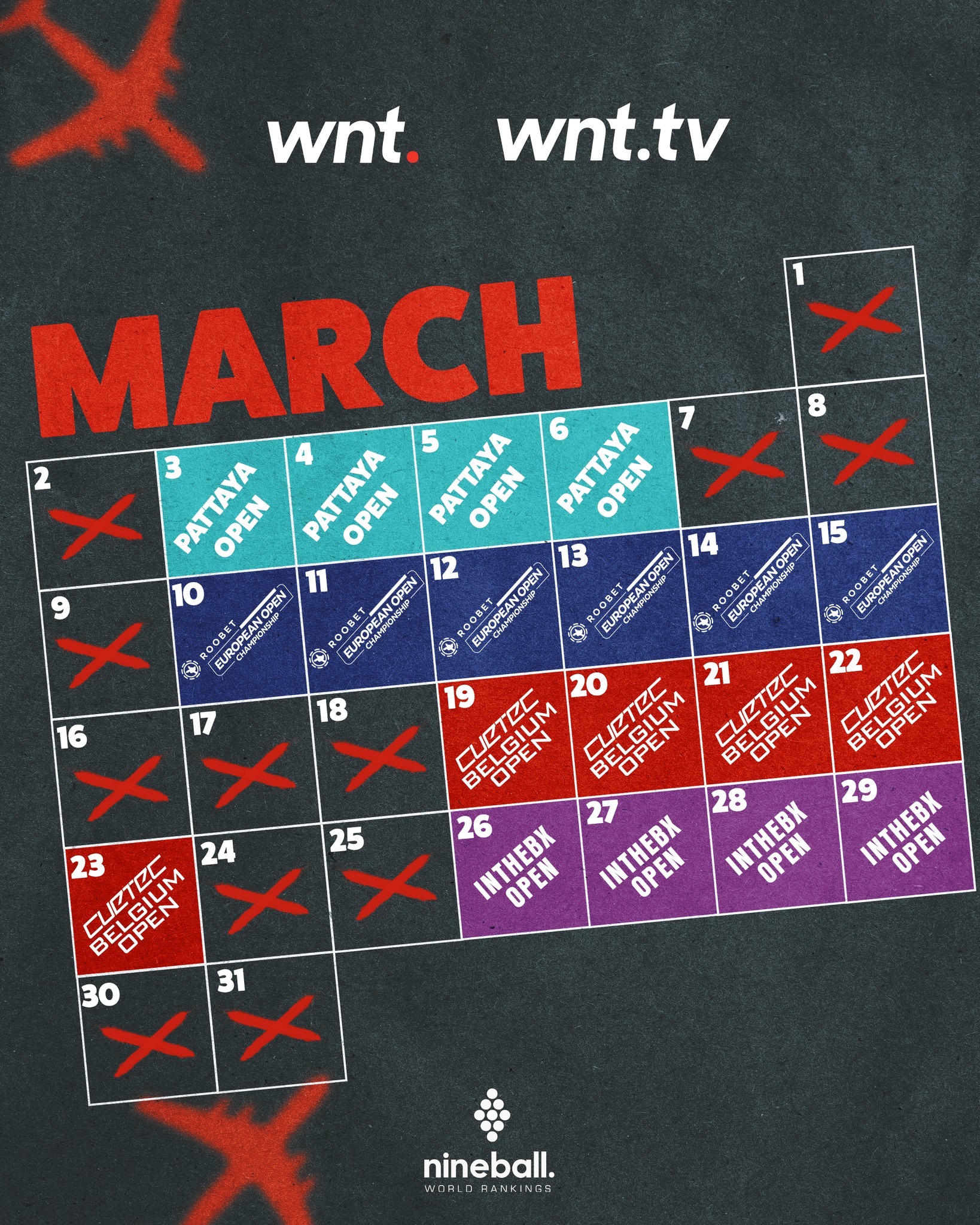 3月に入りタイでのパタヤオープン、今大会と続いたwnt.ランキングイベント、今月はこの後、ベルギー・オーステンデで行われる賞金総額30,000ドル(約480万円)の『Cuetec Belgium Open』(ベルギーオープン/ブロンズ)、アメリカ・ニューヨークを舞台にした賞金総額32,400ドル(約520万円)の『Inthebox Open』(インザボックスオープン/ブロンズ)が開催される予定だ。