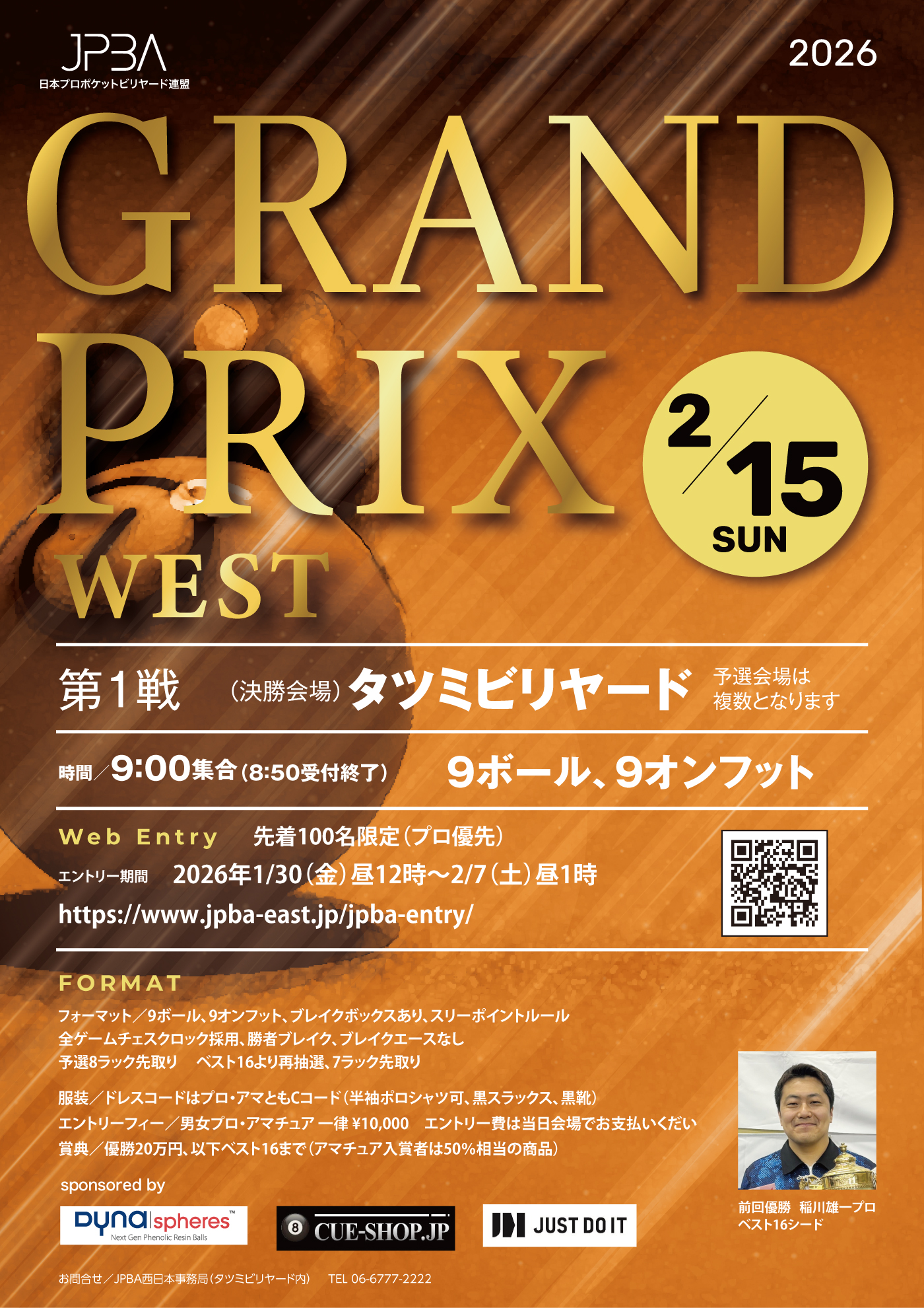 グランプリイーストとは異なり、他支部予選はなくワンデートーナメントとなっているウェスト。第1戦はイーストと同じくナインオンフットのナインボールが種目となるが、こちらは勝者ブレイク、ブレイクボックス採用で、予選が8ラック先取、ベスト16からは7ラック先取で、昨年から採用されているチェスクロックについては、予選が持ち時間55分、ベスト16からは48分となっている。