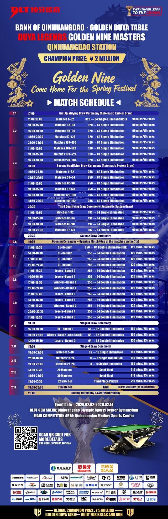 現在は中国国内を中心にメインツアーが展開されており、2025-2026年シーズンはこれまで優勝賞金200万元(約4,000万円)の試合を2戦を消化。最終戦となる2026年5月の『Duya Legends Tour Golden Nine Global Finals』(DLTグローバルファイナル)を含め残り3試合が開催されることとなっていたが、2月2日(月)、本拠地である秦皇島市においてツアー3戦目となる優勝賞金200万元の『DUYA LEGENDS GOLDEN NINE MASTERS』(ゴールデンナインマスターズ)が開幕した。